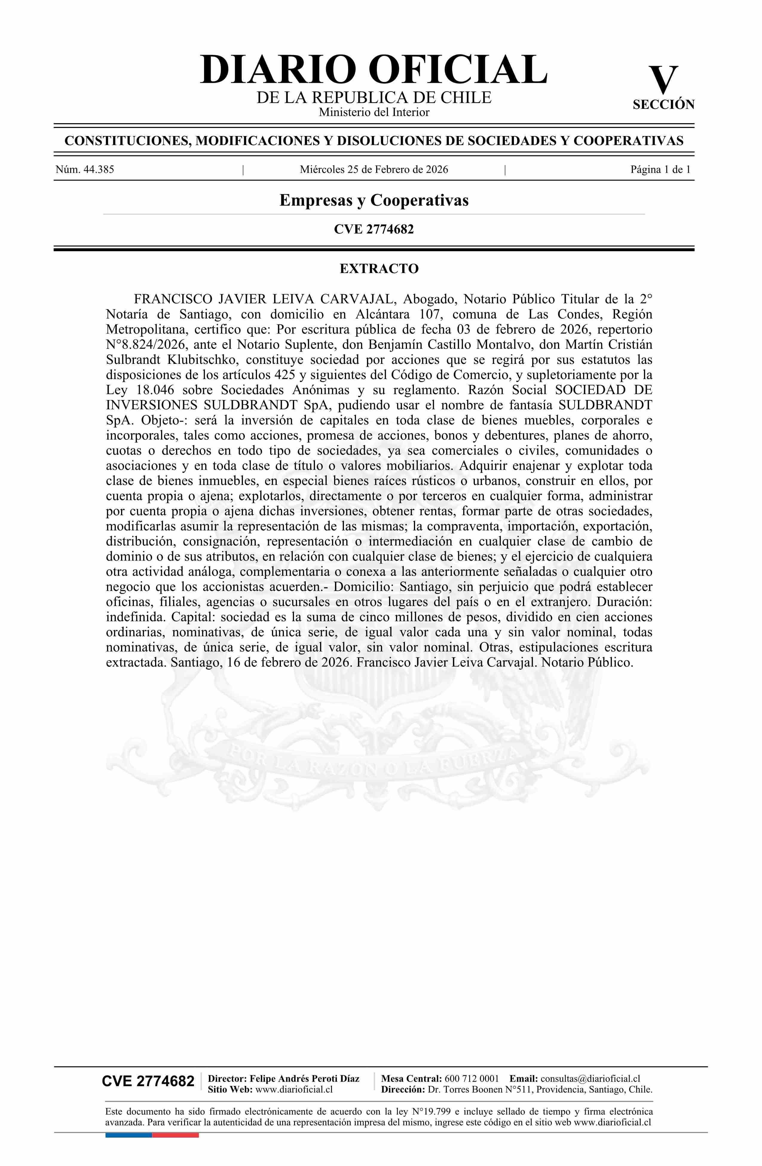 SOCIEDAD DE INVERSIONES SULDBRANDT SpA