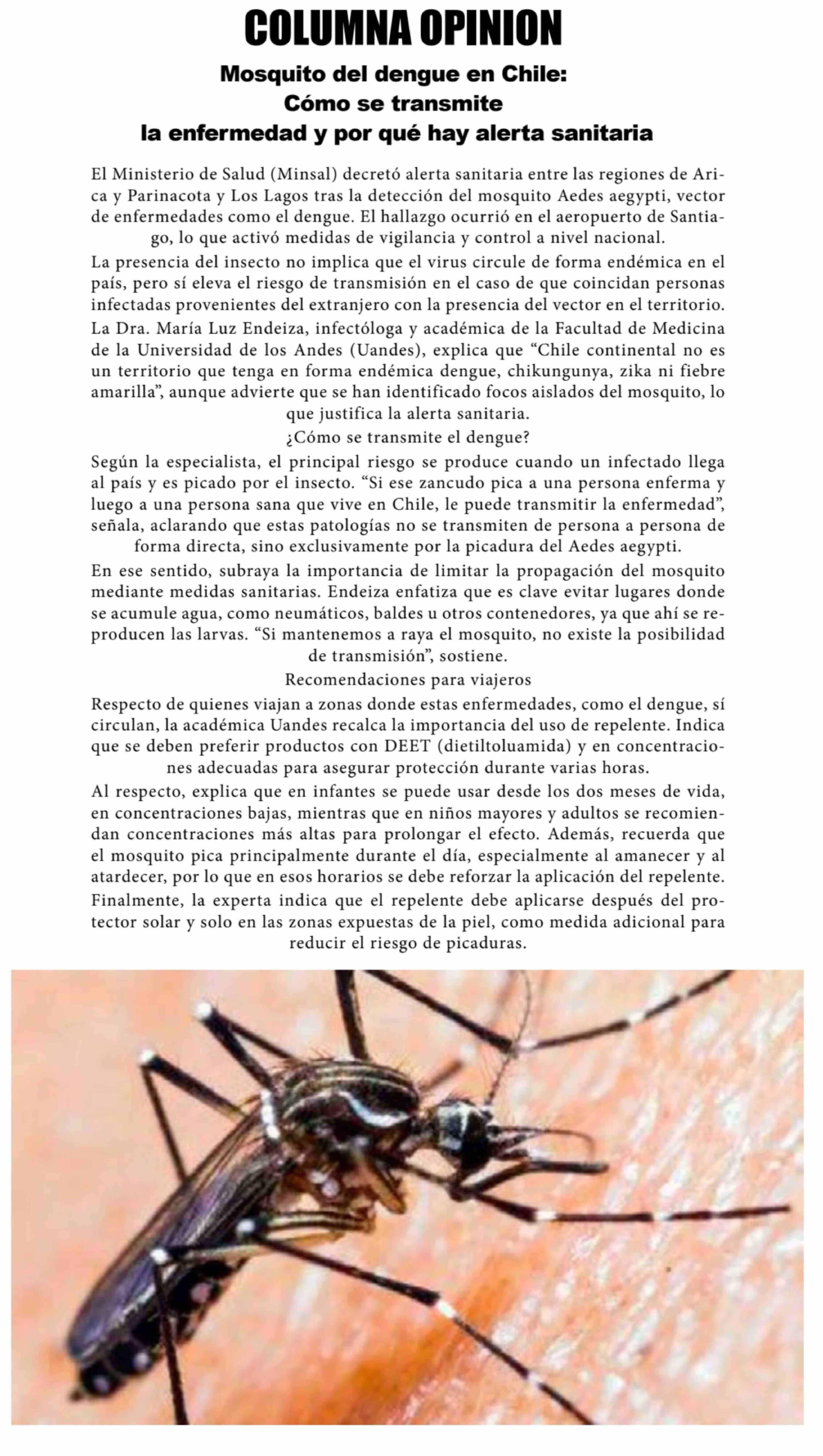 | Título: | Columnas de Opinión: El Ministerio de Salud (Minsal) decretó alerta sanitaria entre las regiones de Arica y Parinacota y Los Lagos tras la detección del mosquito Aedes aegypti, vector de enfermedades como el dengue. El hallazgo ocurrió en el aeropuerto de Santiago, lo que activó medidas de vigilanci |