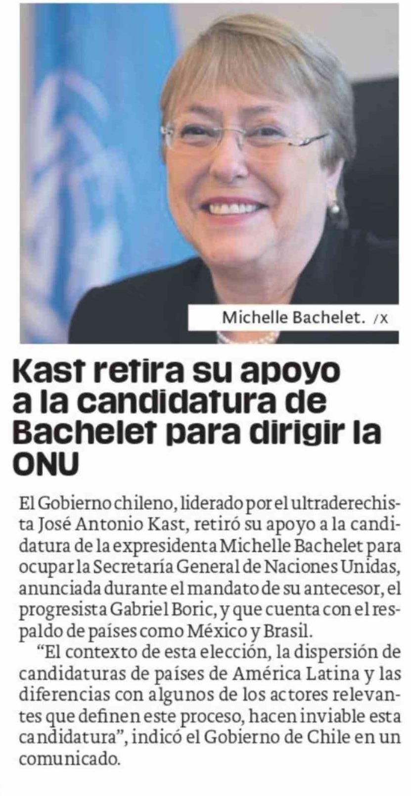 Kast retira su apovo a la candidatura de Bachelet para dirigir la ONU