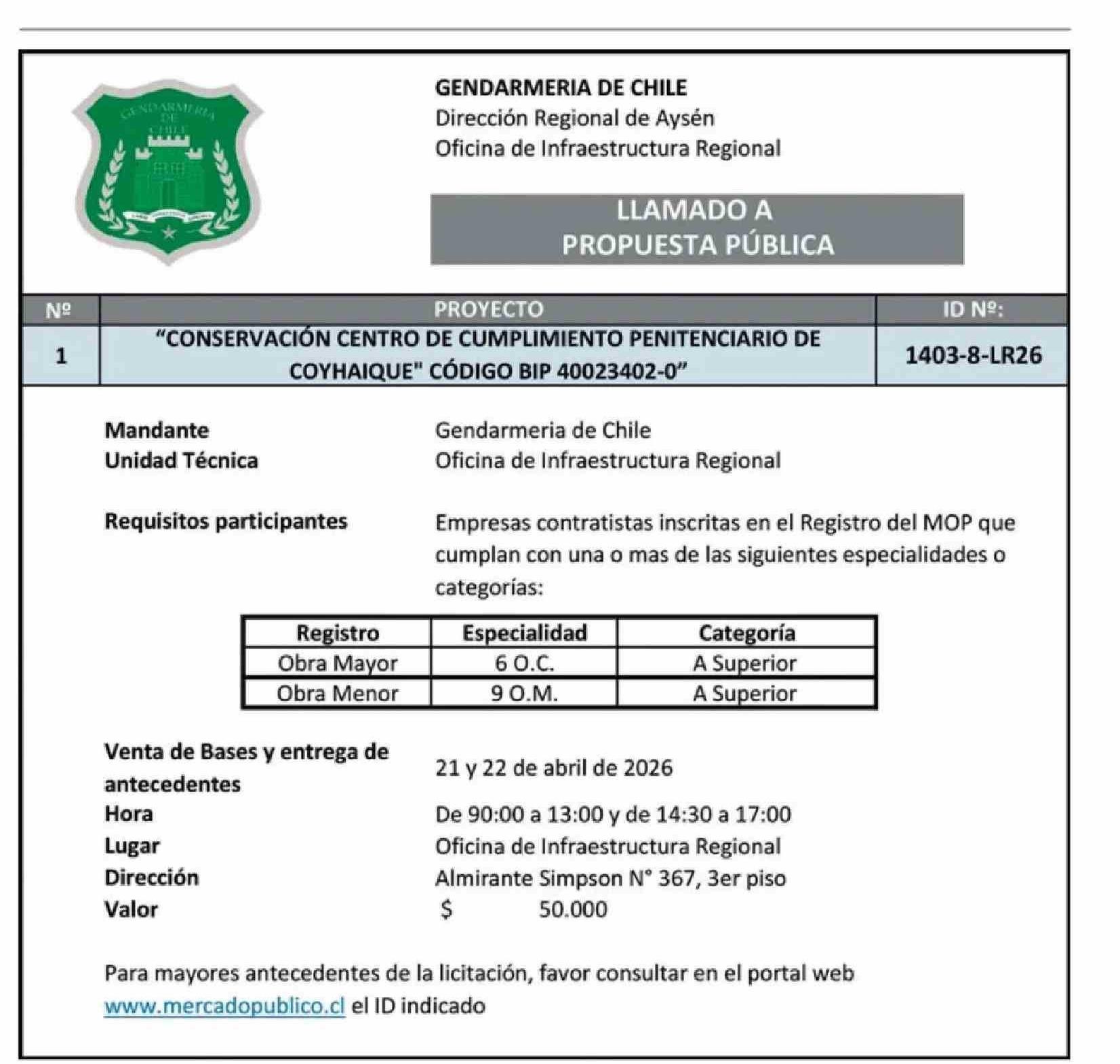 AVISO LICITACIONES: GENDARMERÍA DE CHILE