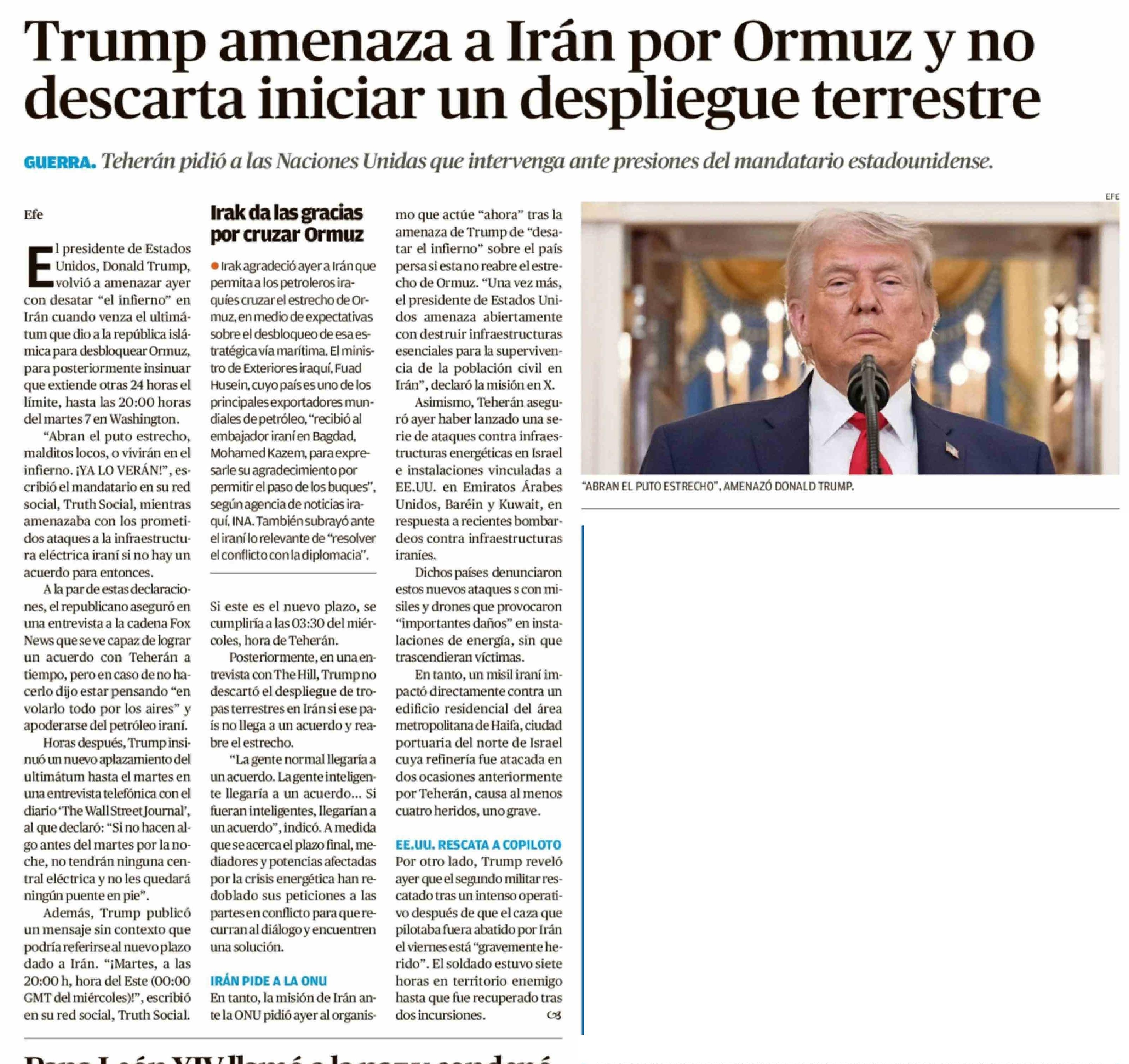 Trump amenaza a Irán por Ormuz y no descarta iniciar un despliegue terrestre