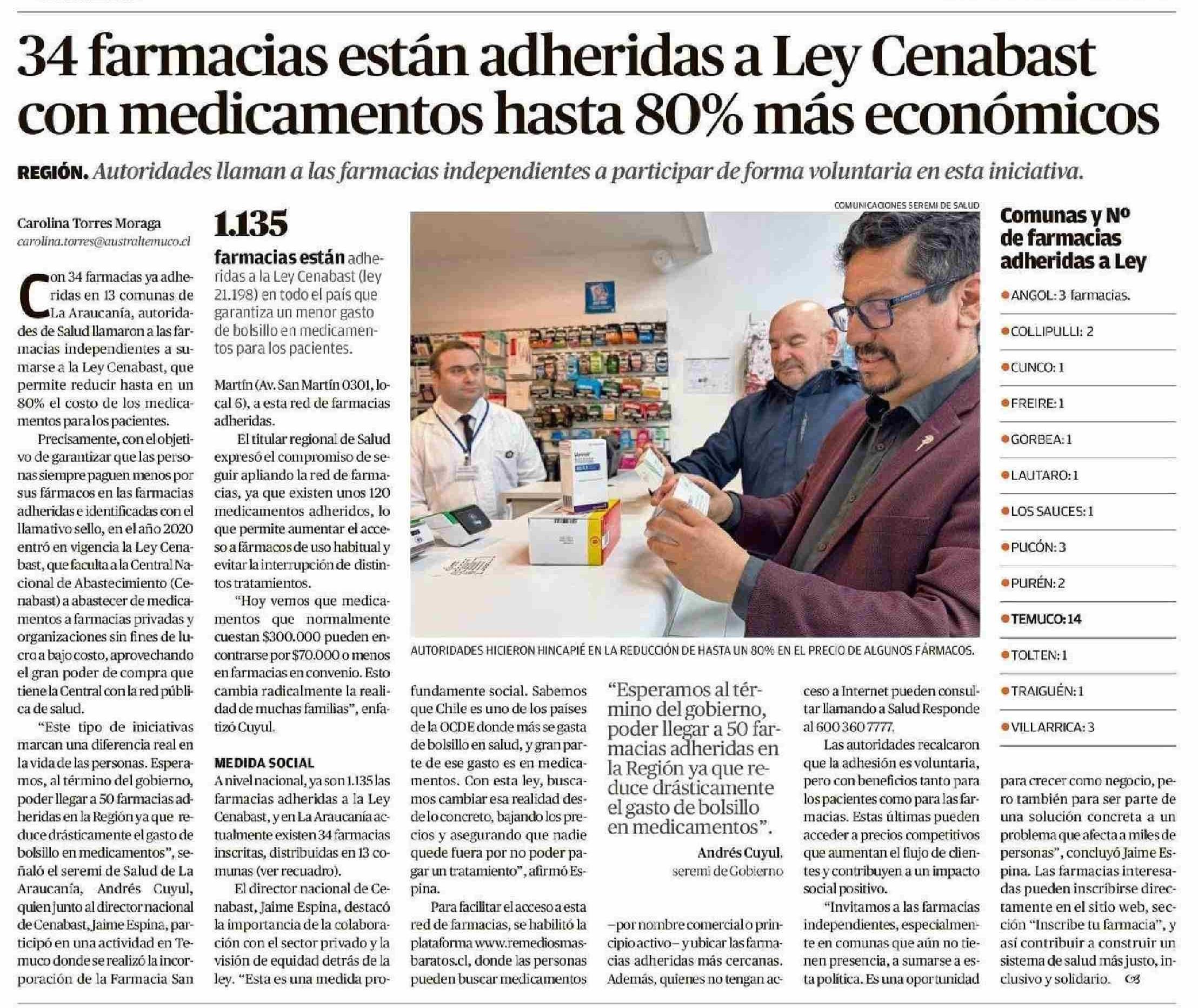 34 Farmacias están adheridas a Ley Cenabast con medicamentos hasta 80% más económicos