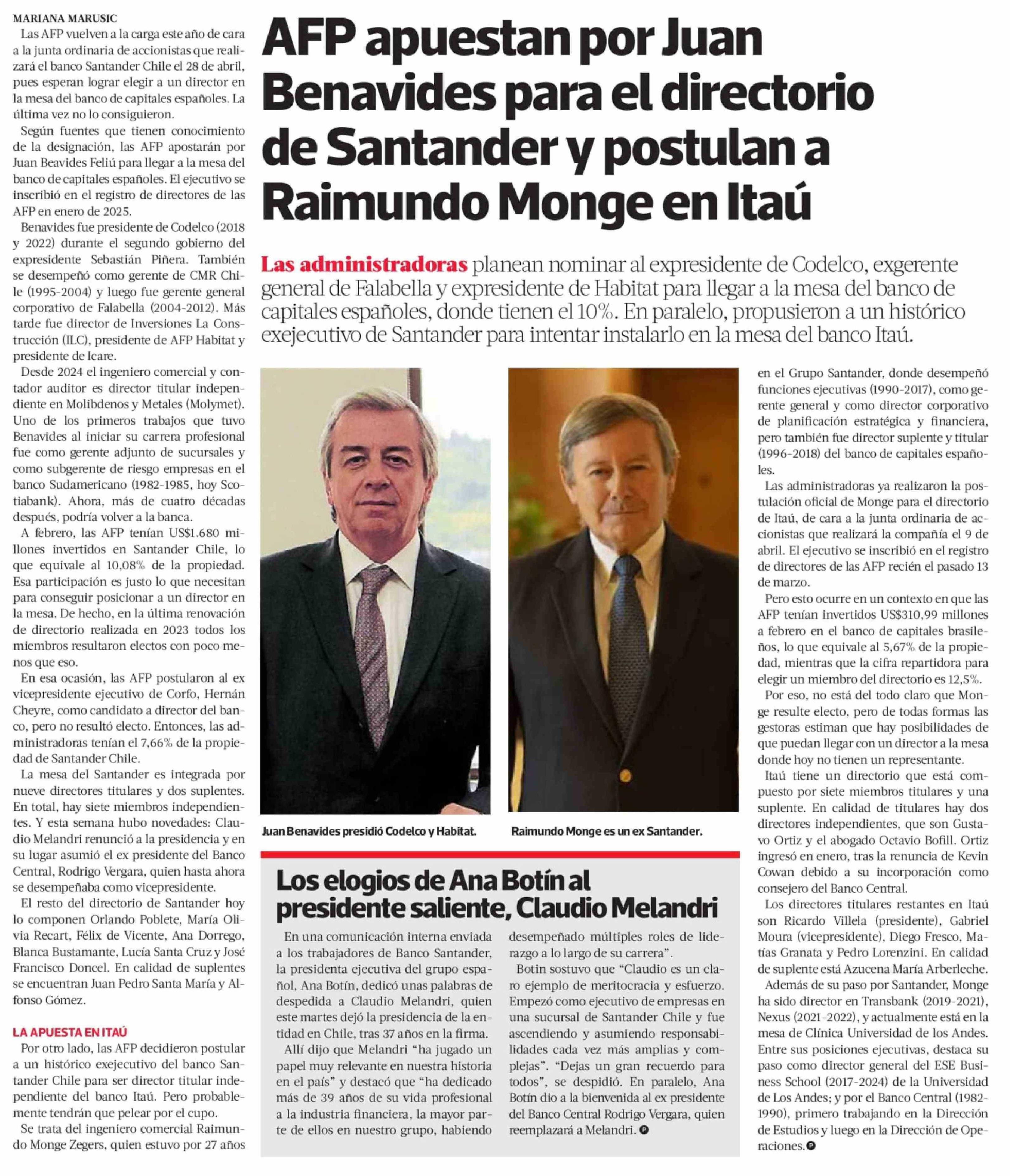 Título: AFP apuestan por Juan Benavides para el directorio de Santander y postulan a Raimundo Monge en Itaú