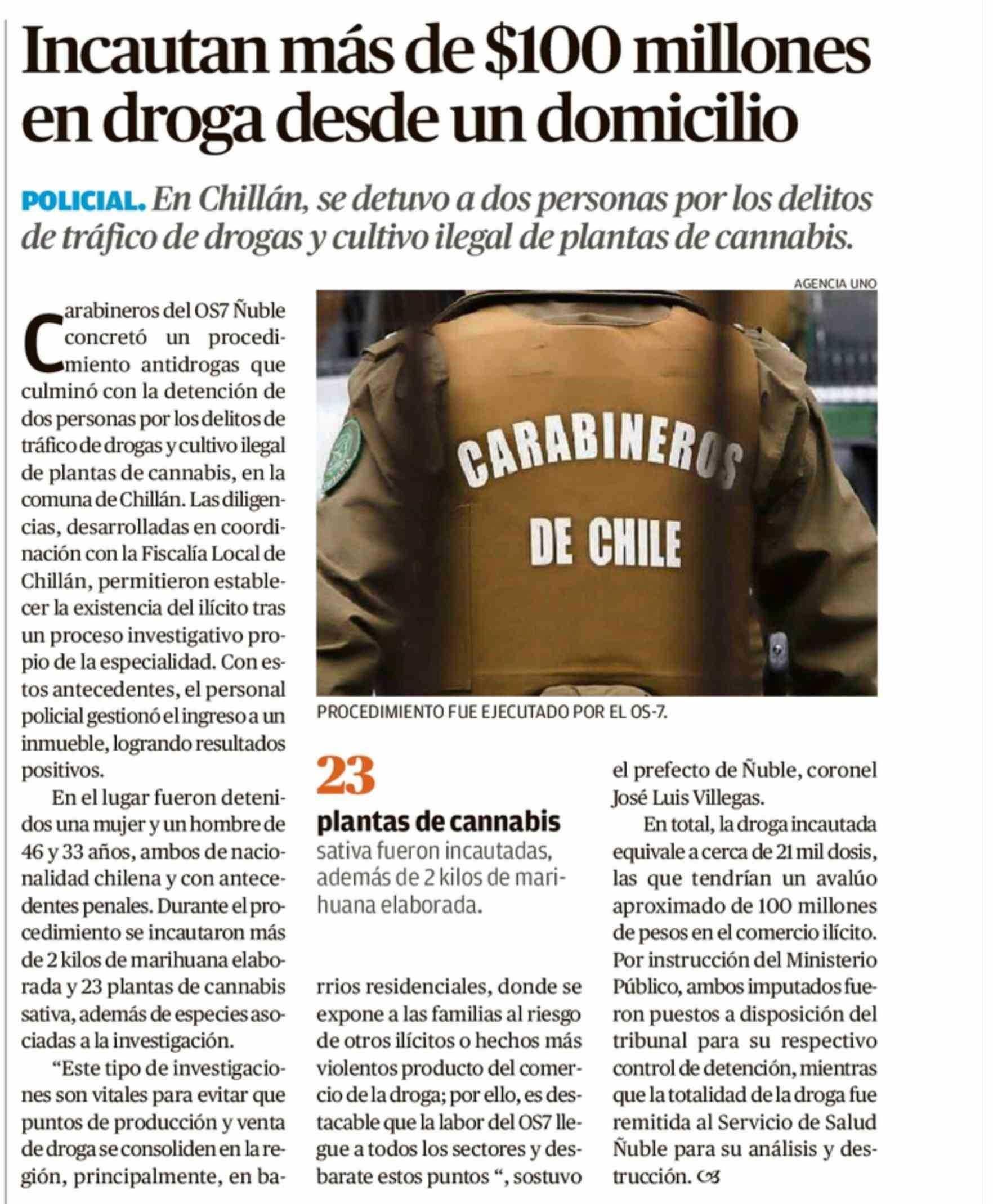 Título: Incautan más de $100 millones en droga desde un domicilio