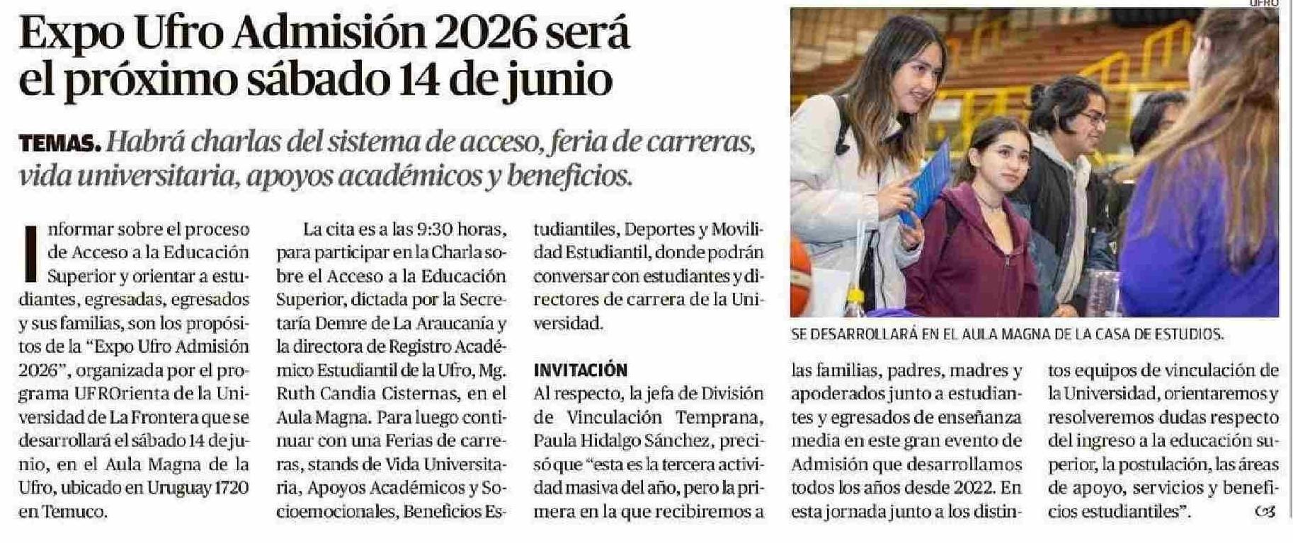 Expo Ufro Admisión 2026 será el próximo sábado 14 de junio