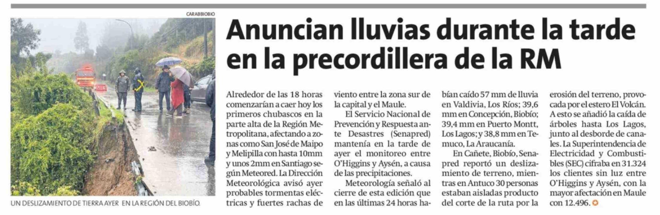 Anuncian lluvias durante la tarde en la precordillera de la RM