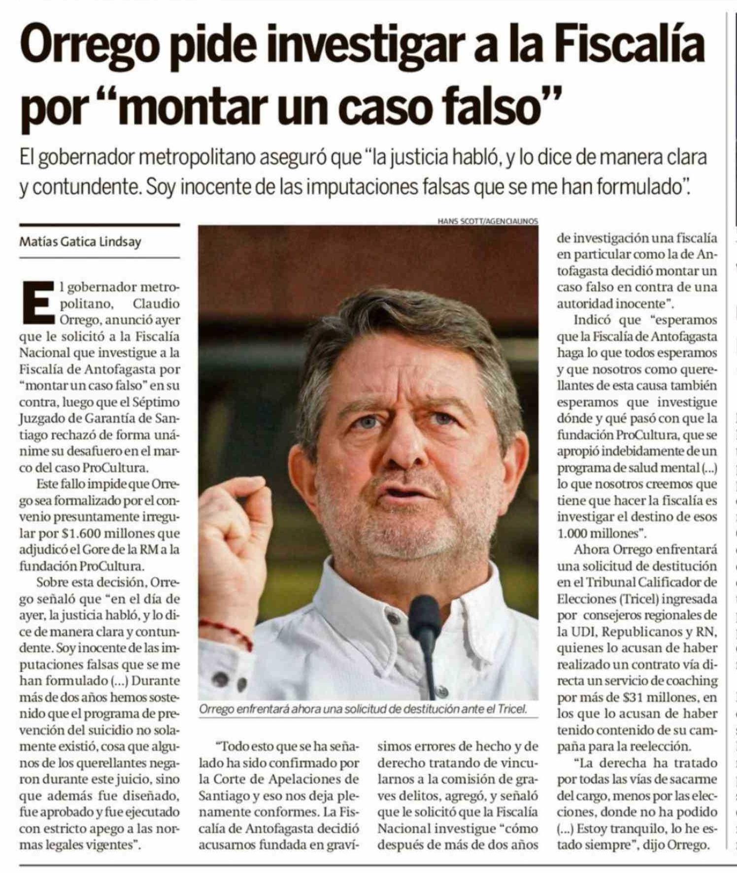 Orrego pide investigar a la Fiscalía por "montar un caso falso"