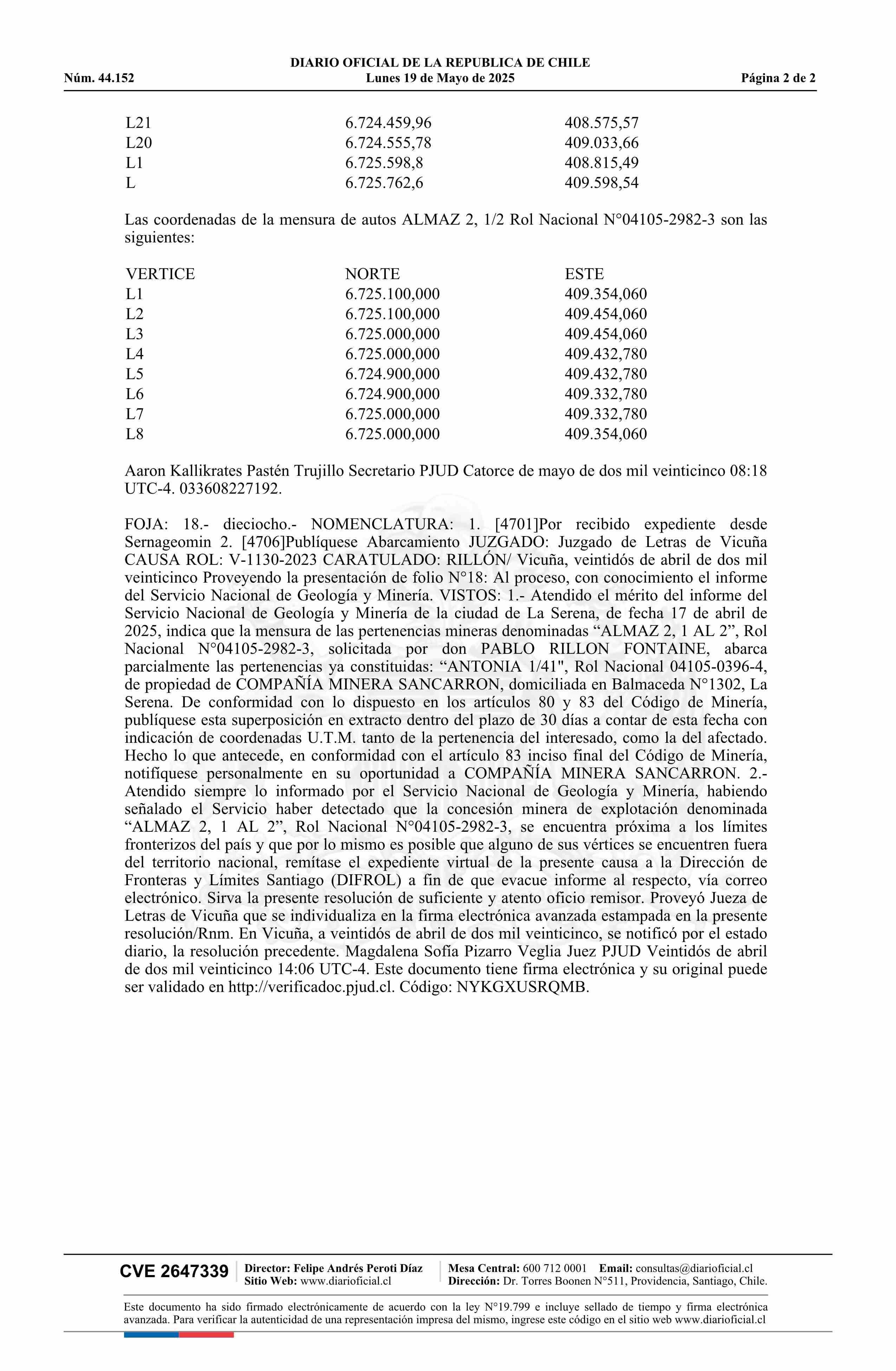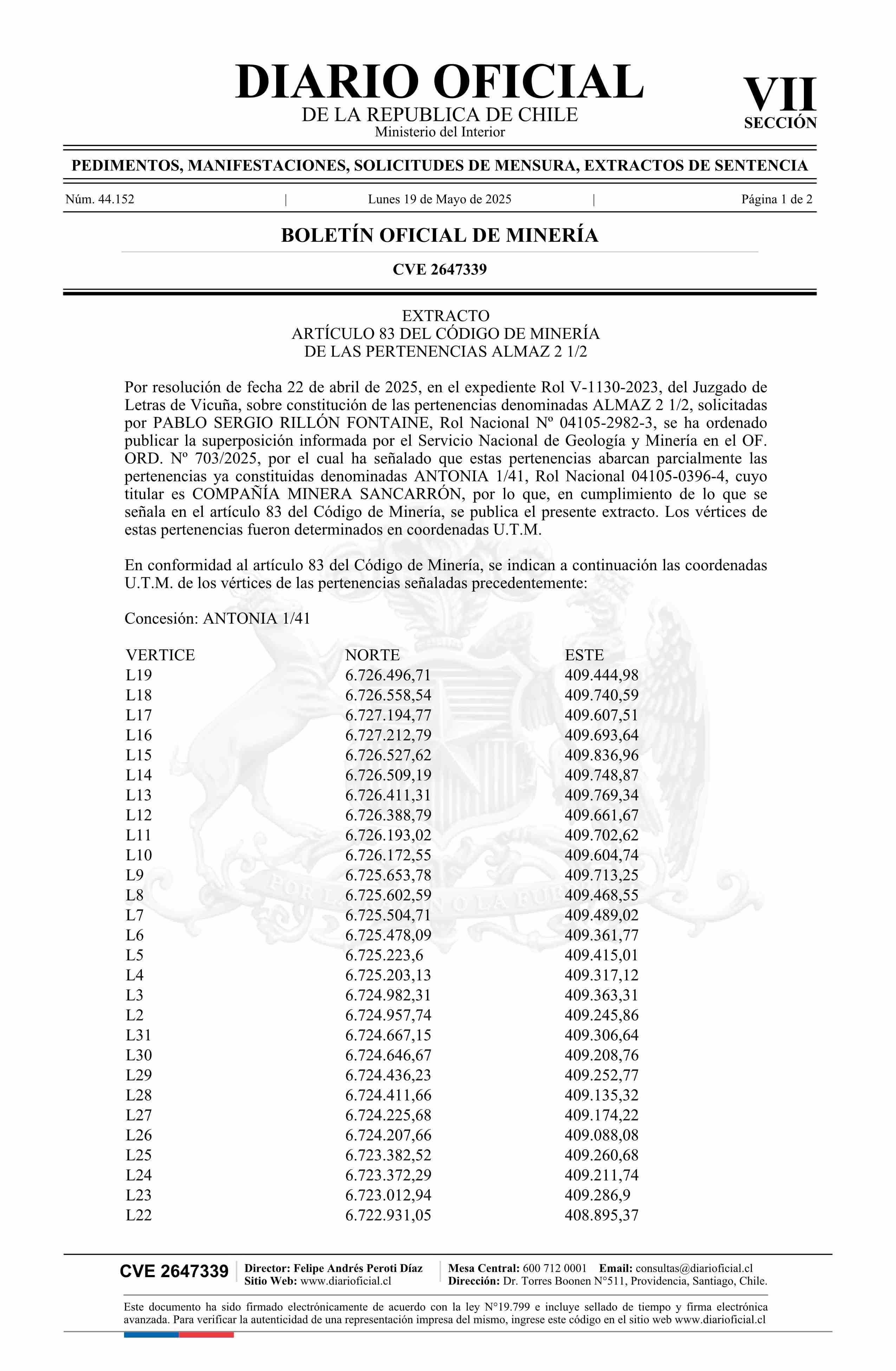 DIARIO OFICIAL CHILE - BOLETÍN OFICIAL DE MINERÍA (DIARIO OFICIAL CHILE – BOM – EXTRACTOS ARTÍCULO 83)