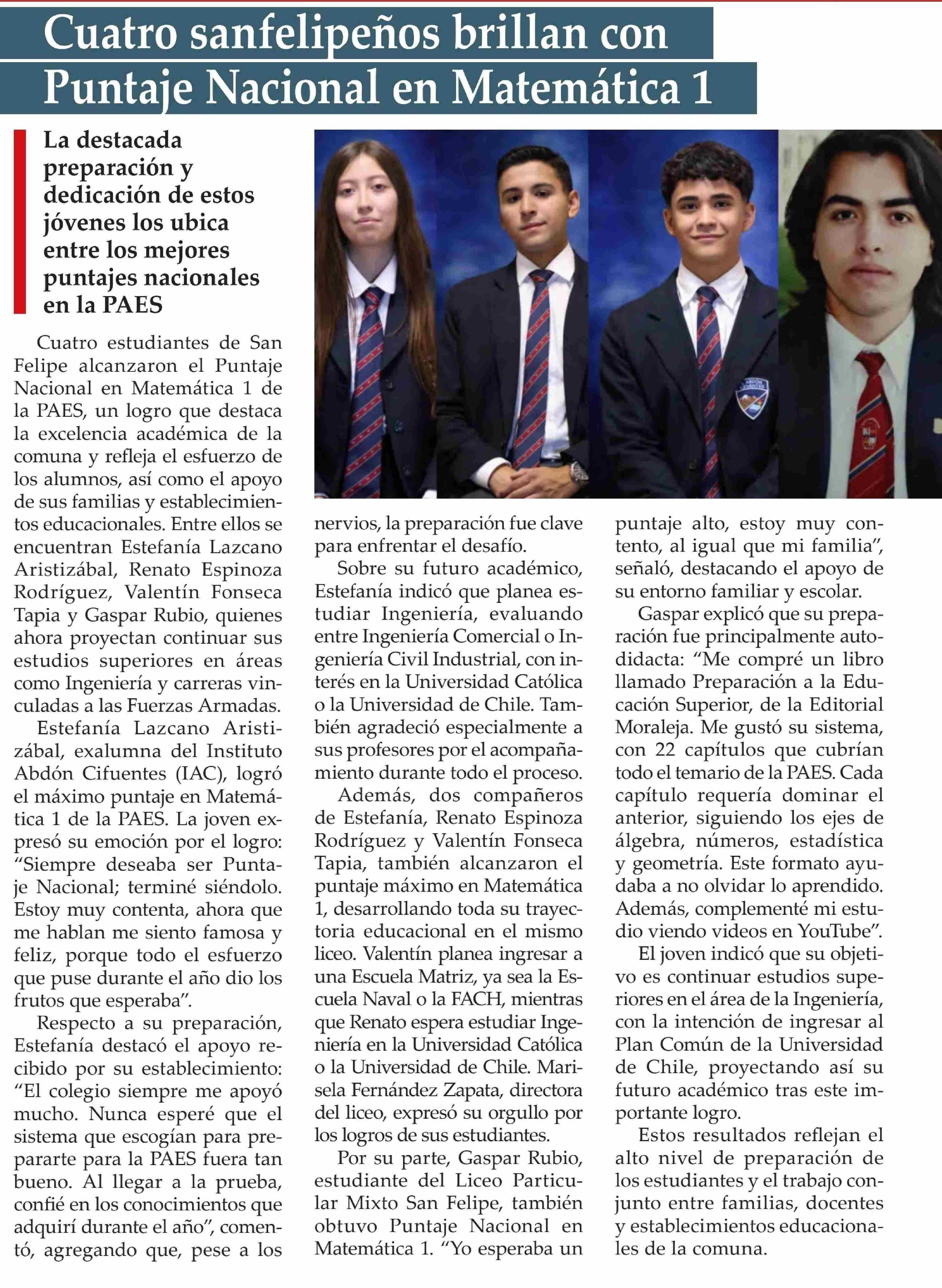 Título: Cuatro sanfelipeños brillan con Puntaje Nacional en Matemática 1