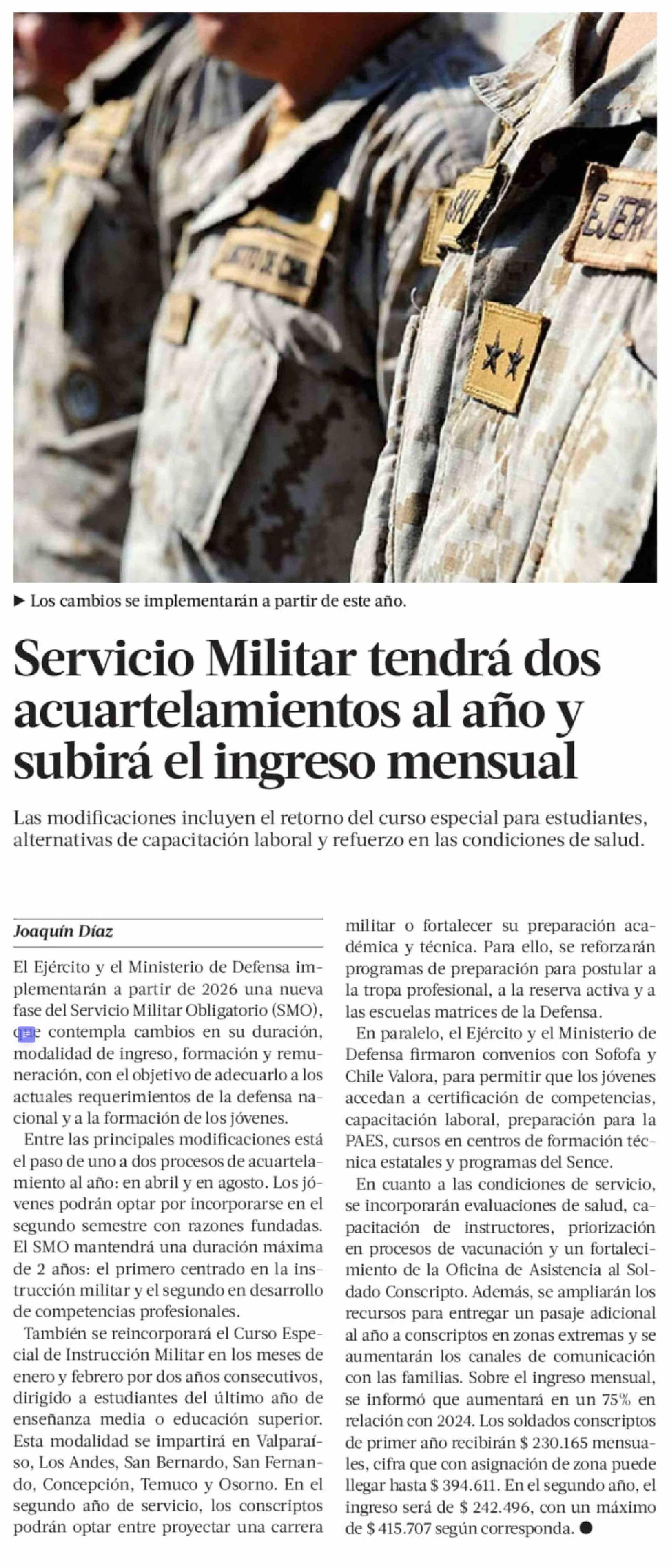 Título: Servicio Militar tendrá dos acuartelamientos al año y subirá el ingreso mensual
