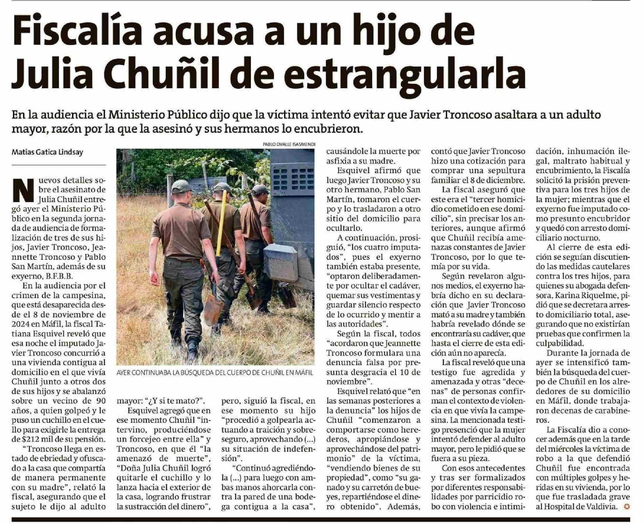 Fiscalía acusa a un hijo de Julia Chunil de estrangularla