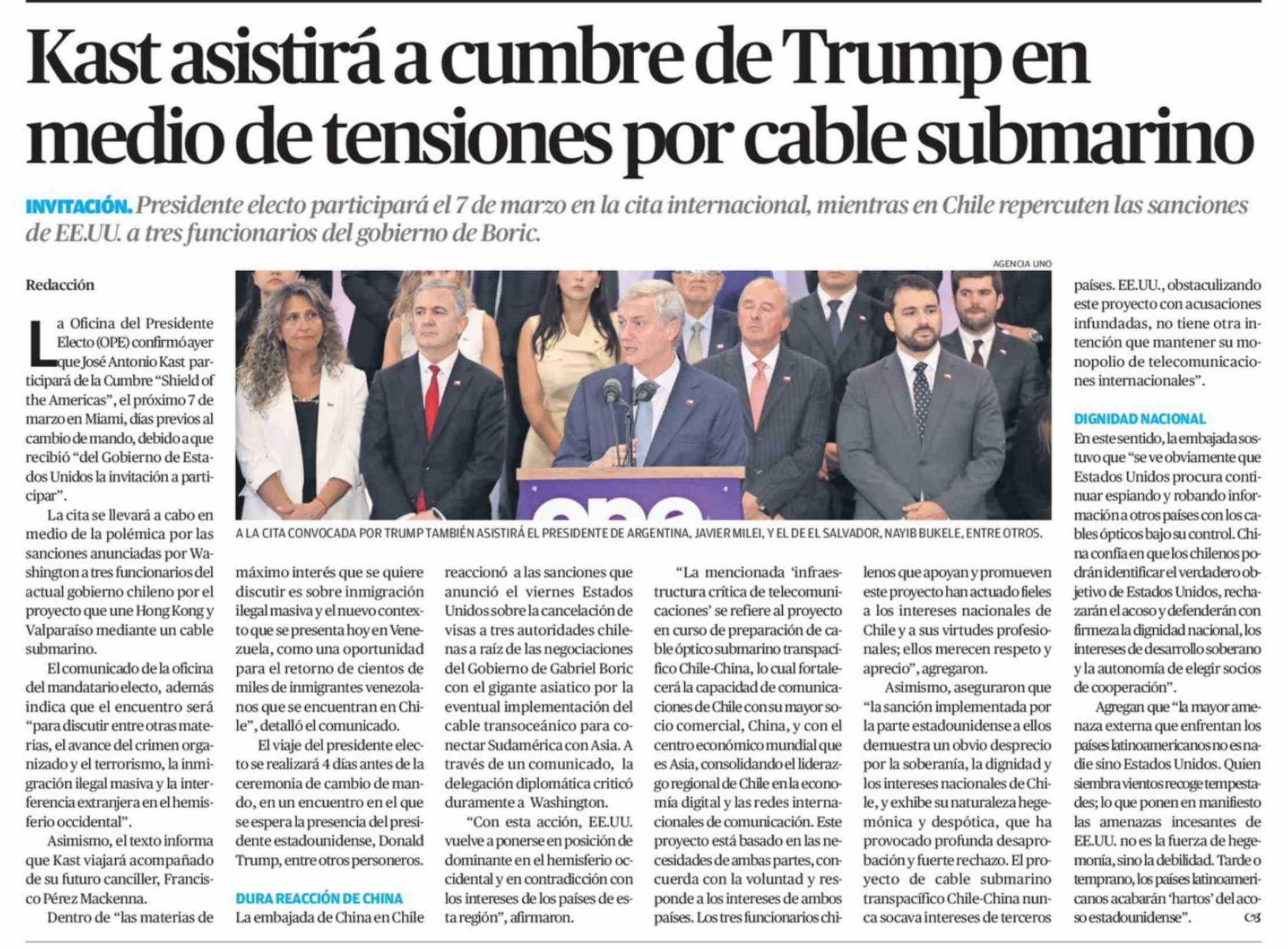 Kast asistirá a cumbre de Trump en medio de tensiones por cable submarino