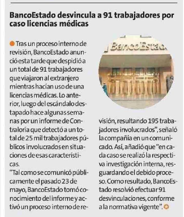 BancoEstado desvincula a 91 trabajadores por caso licencias médicas