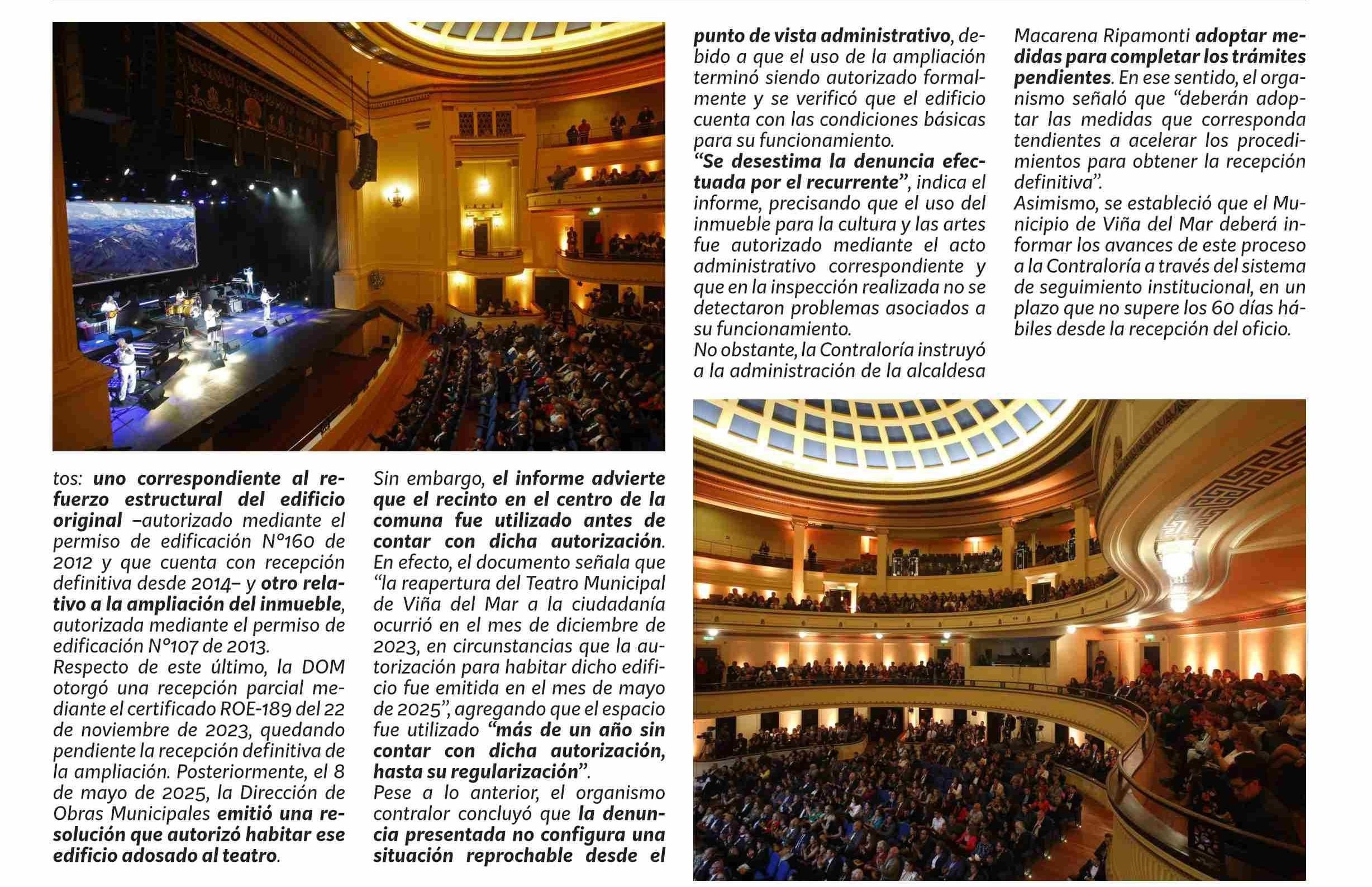 Contraloría ordena acelerar recepción definitiva de ampliación del Teatro Municipal de Viña: se usó un año y medio sin permiso