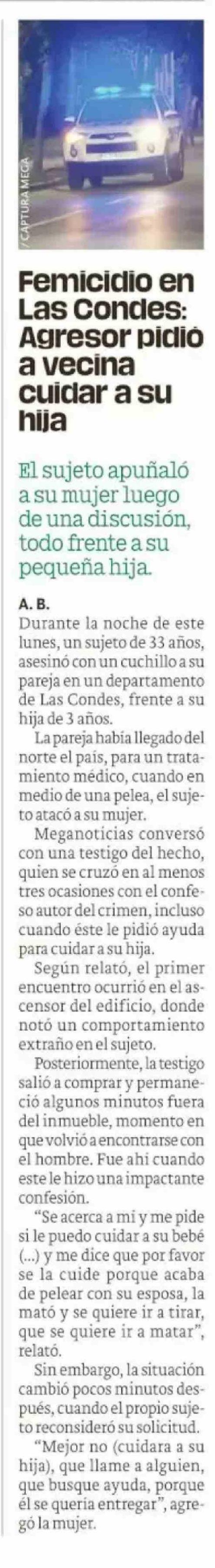 Femicidio en Las Condes: Agresor pidio a vecina cuidar a su hija