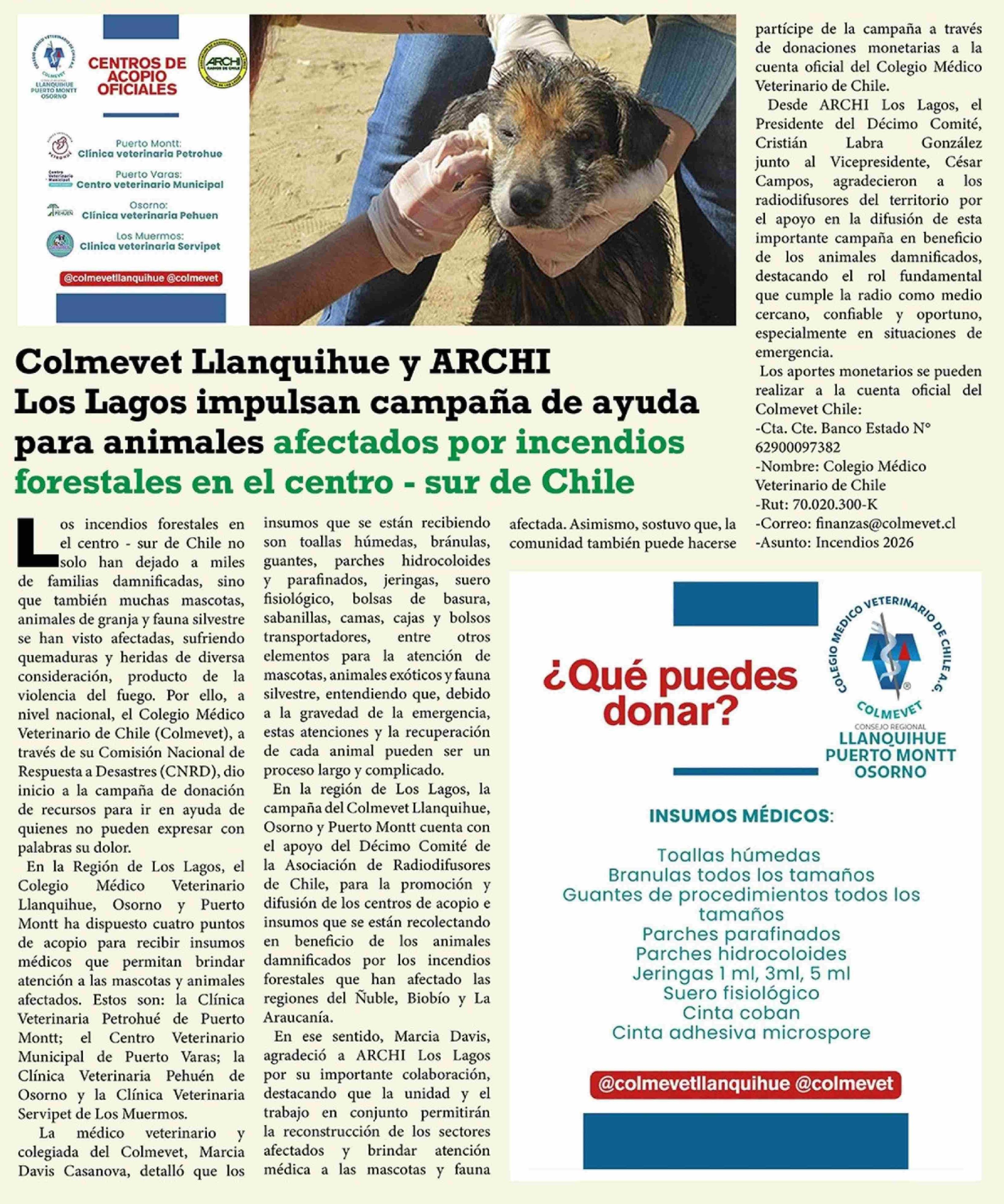 Colmevet Llanquihue y ARCHI Los Lagos impulsan campaña de ayuda para animales afectados por incendios forestales en el centro - sur de Chile