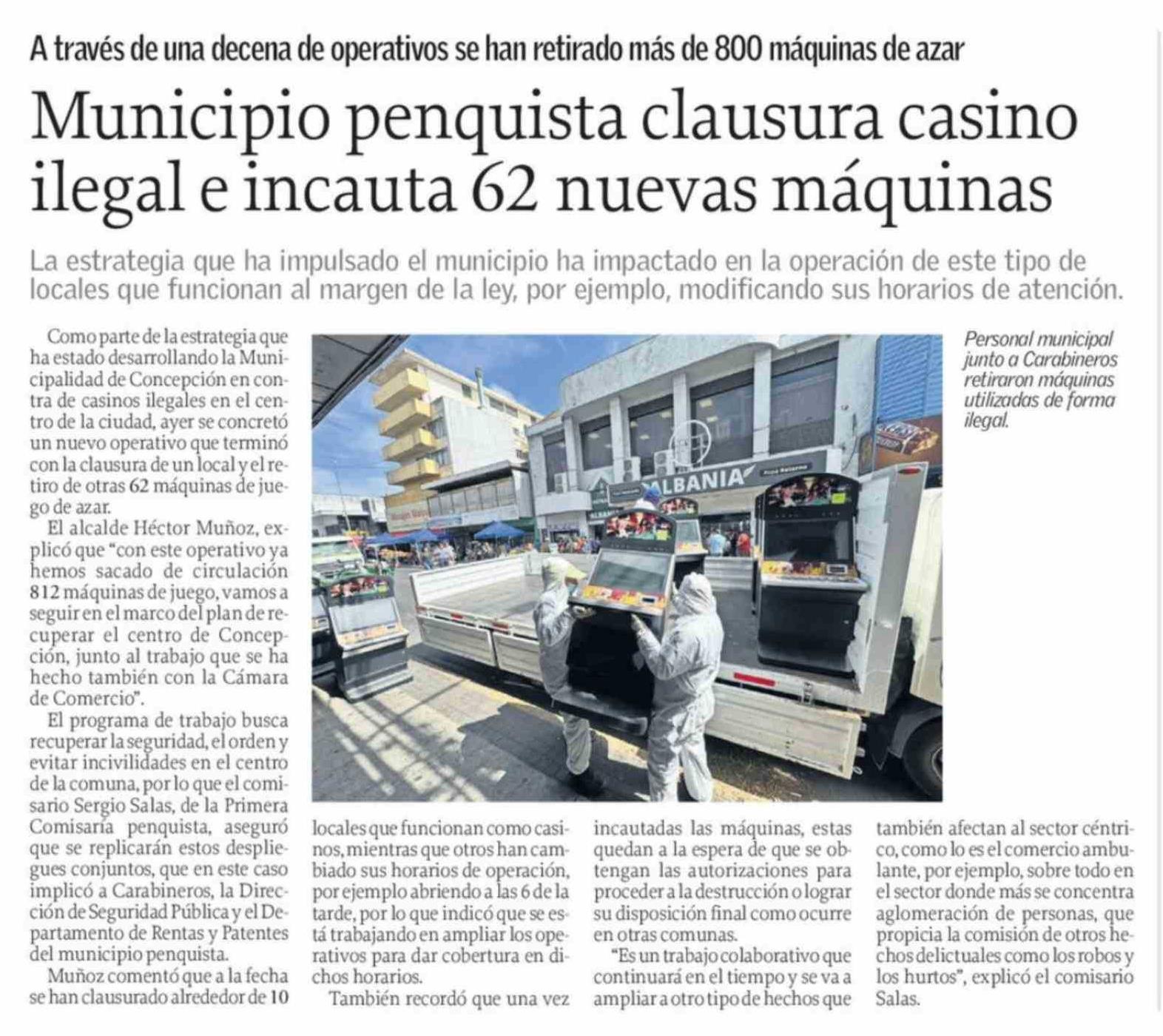 Municipio penquista clausura casino ilegal e incauta 62 nuevas máquinas