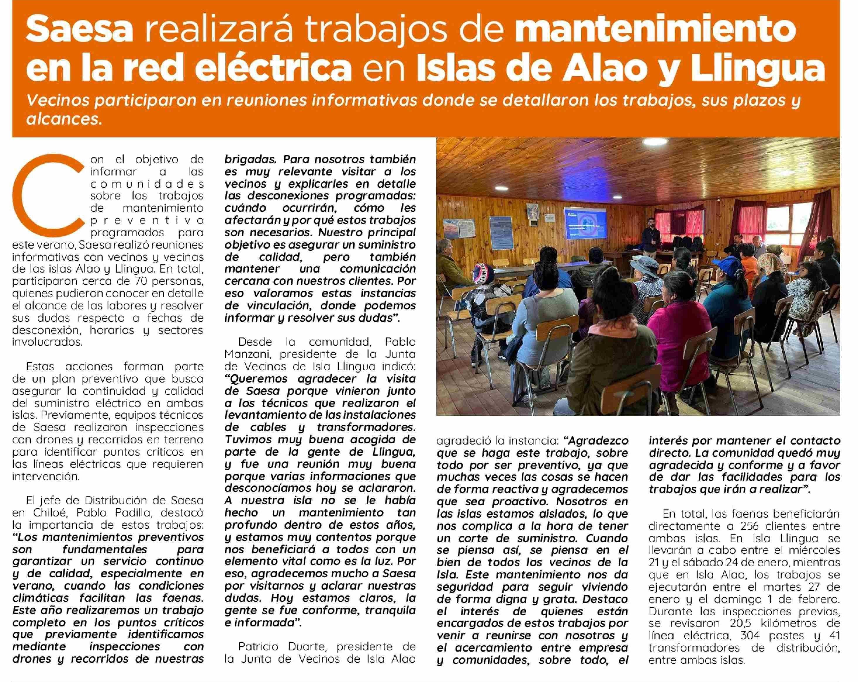 Saesa realizará trabajos de mantenimiento en la red eléctrica en Islas de Alao y Llingua