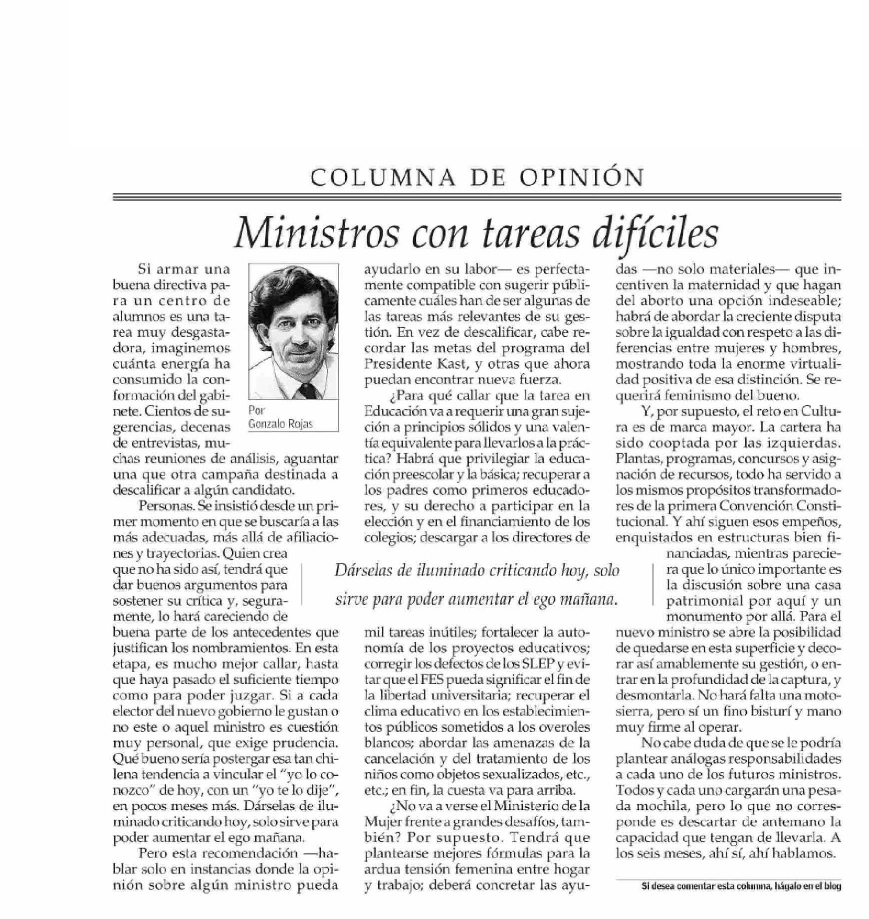 COLUMNAS DE OPINIÓN: Ministros con tareas difíciles