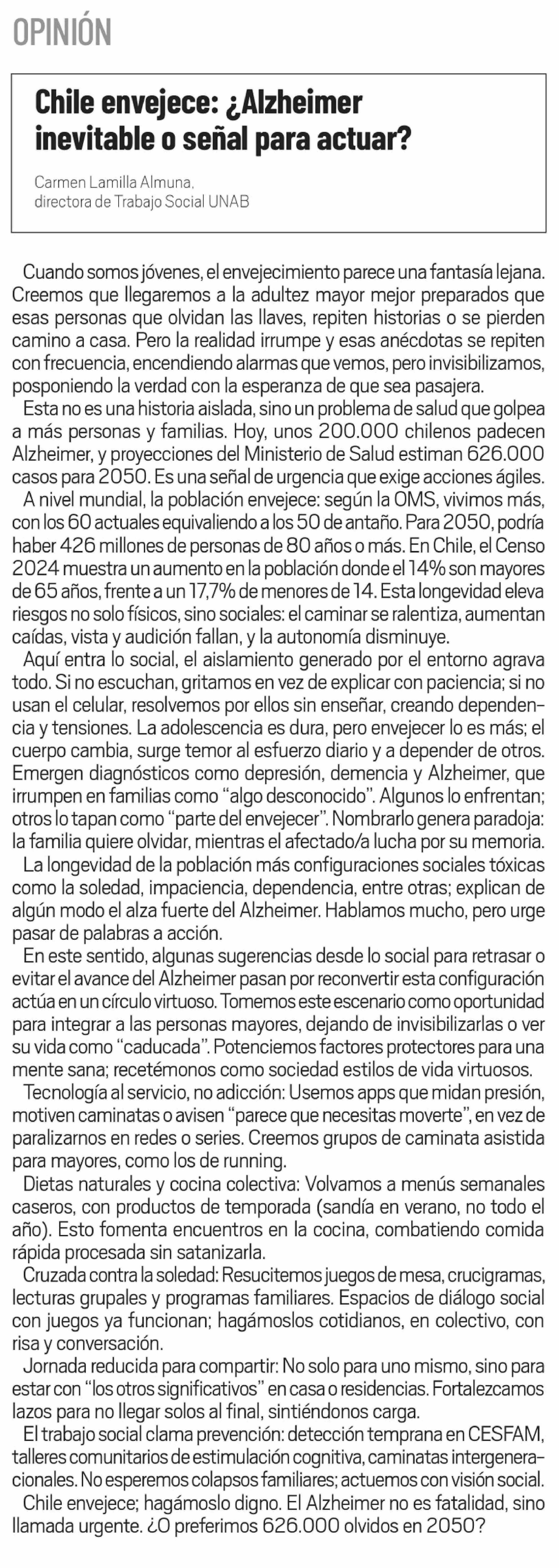 Columnas de Opinión: Chile envejece: ¿ Alzheimer inevitable o señal para actuar?