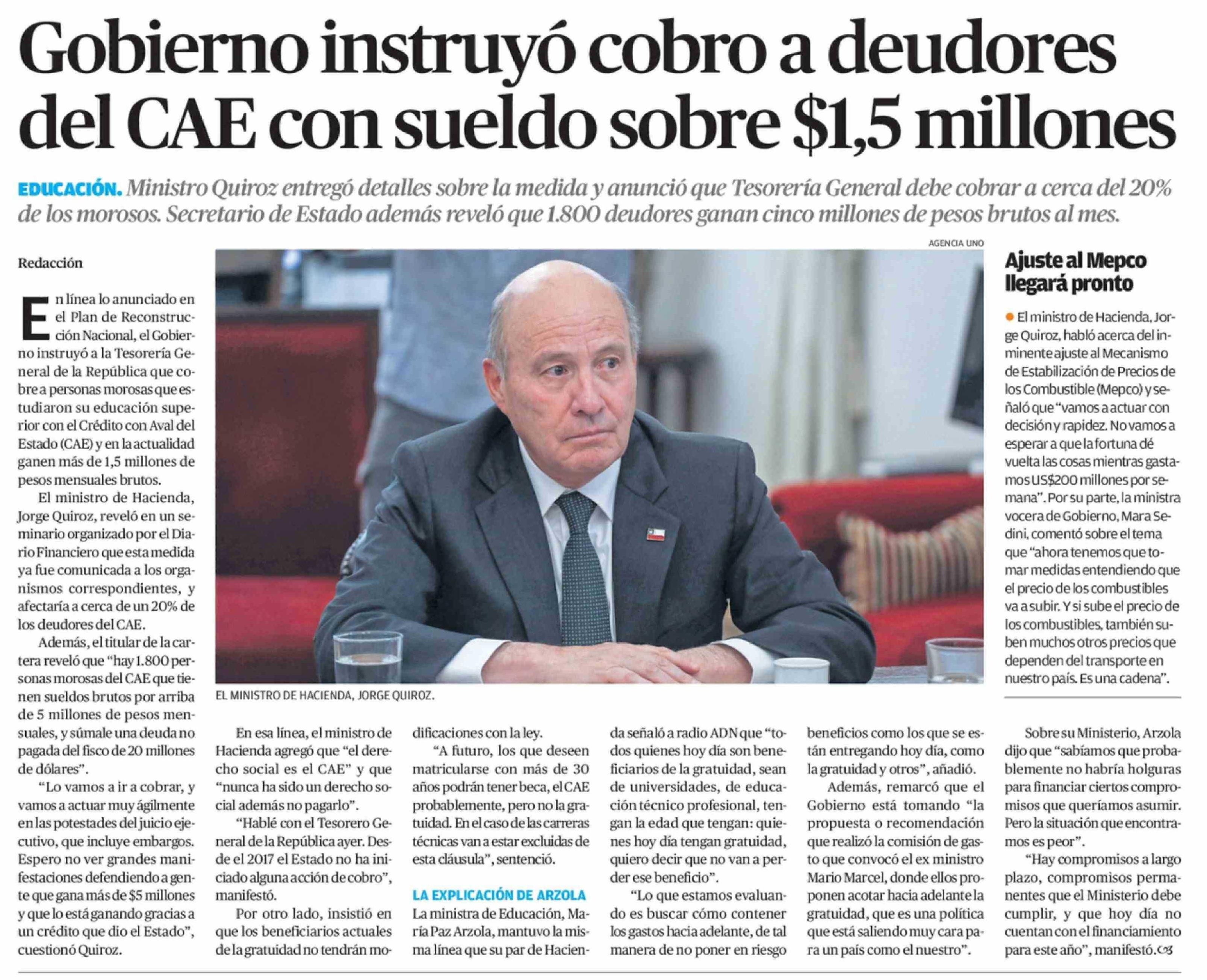 Título: Gobierno instruyó cobro a deudores del CAE con sueldo sobre $1,5 millones