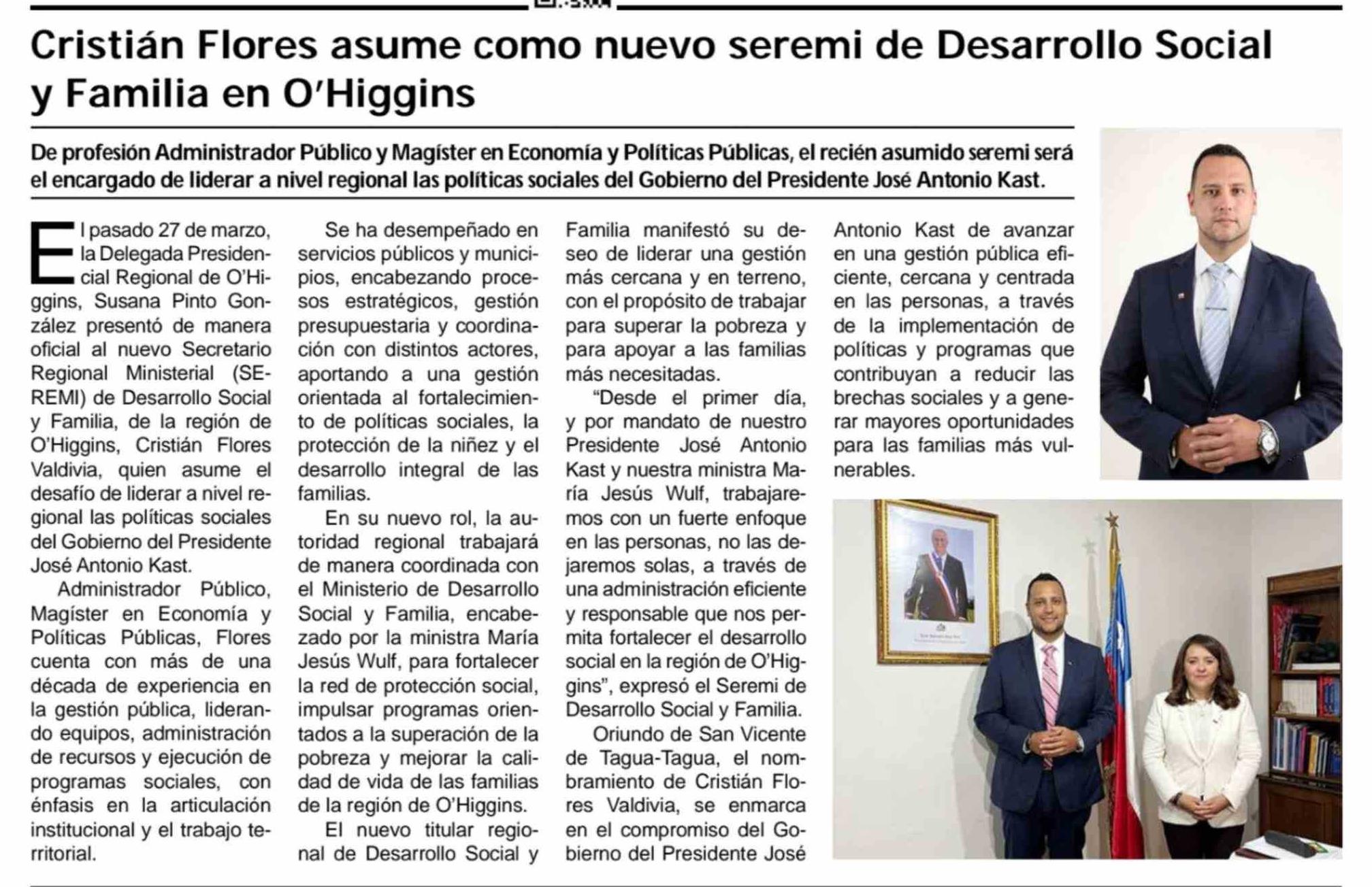 Cristian Flores asume como nuevo seremi de Desarrollo Social y Familia en O'Higgins