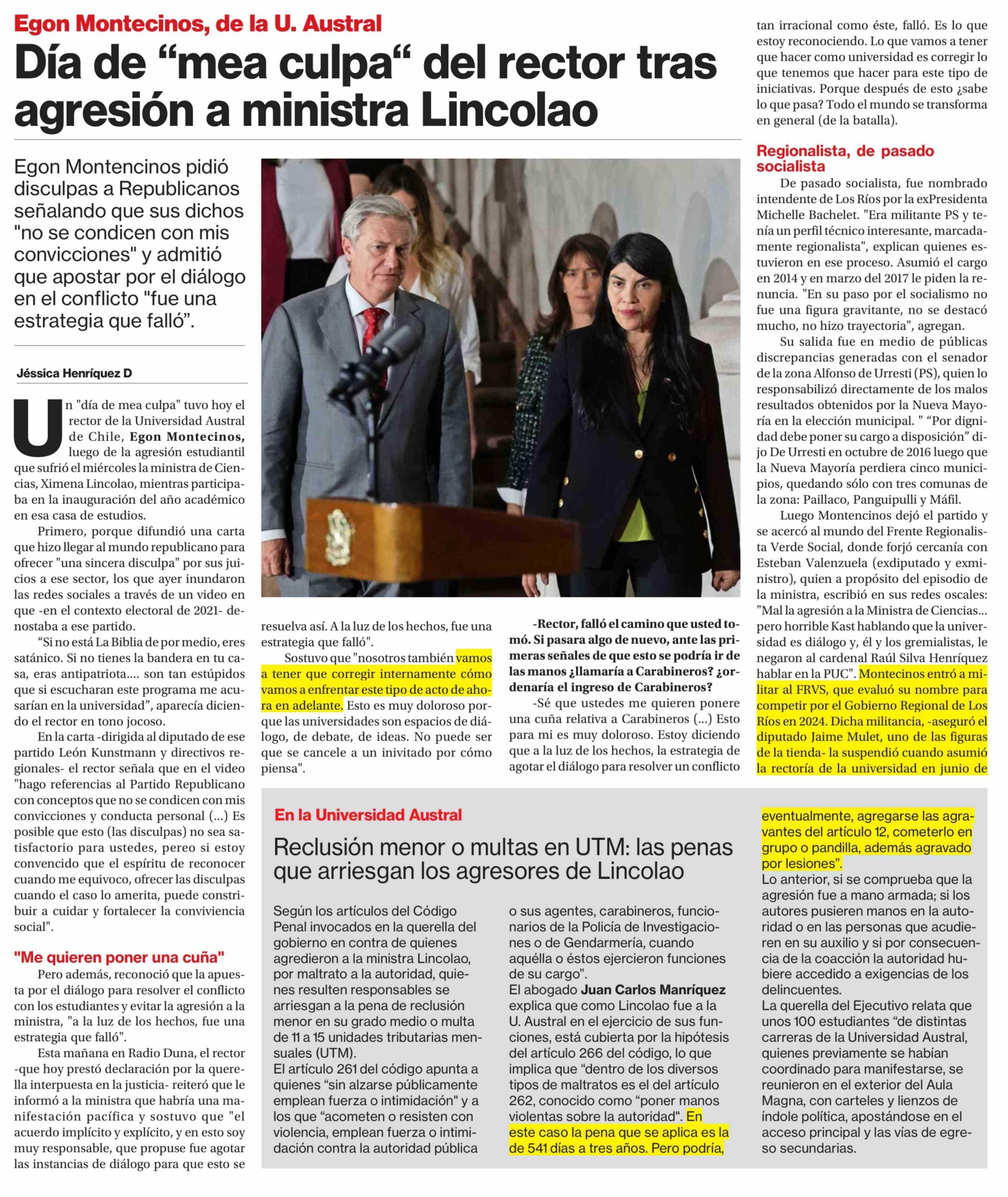 Día de "mea culpa" del rector tras agresión a ministra Lincolao
