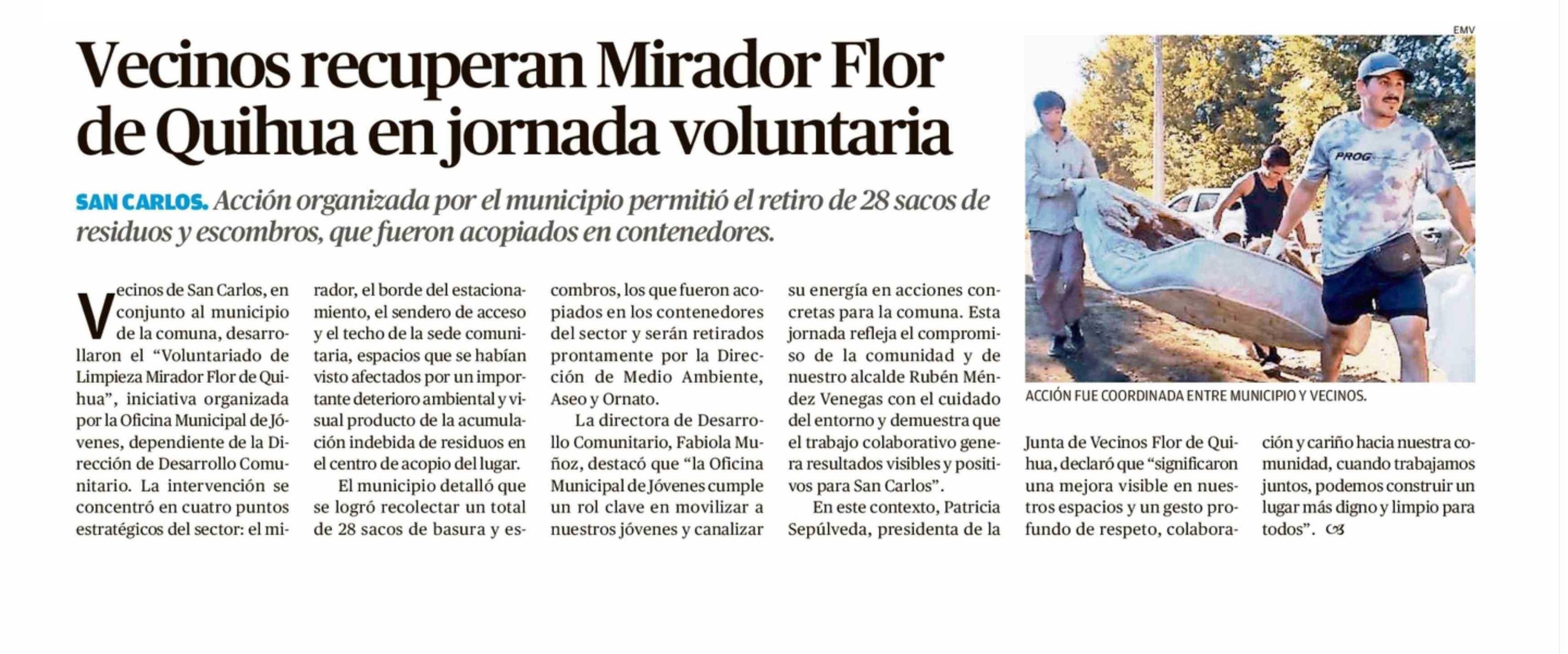 Vecinos recuperan Mirador Flor de Quihua en jornada voluntaria