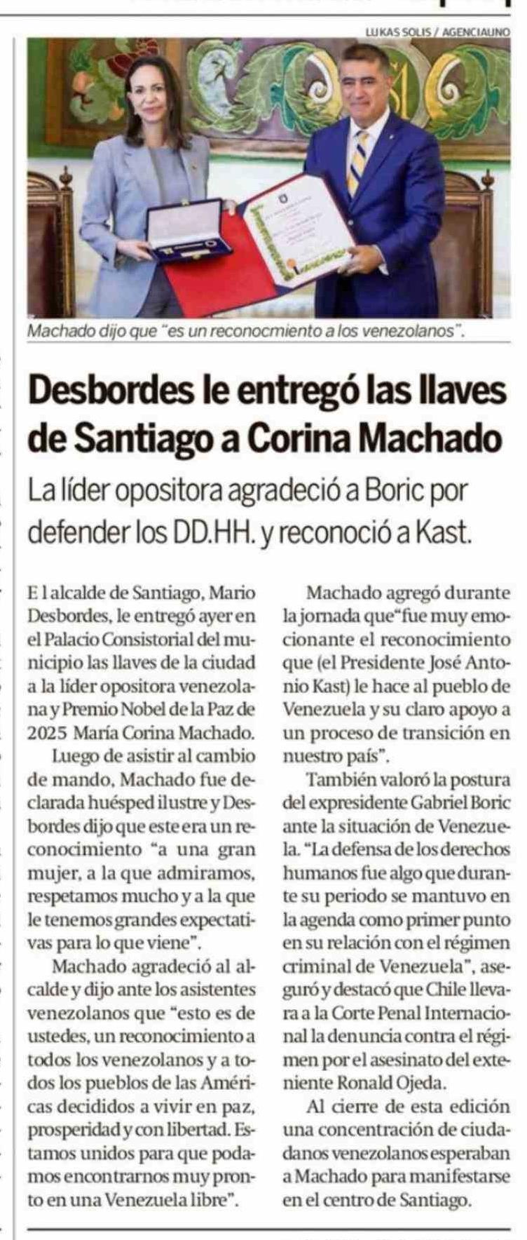 Desbordes le entregó las llaves de Santiago a Corina Machado