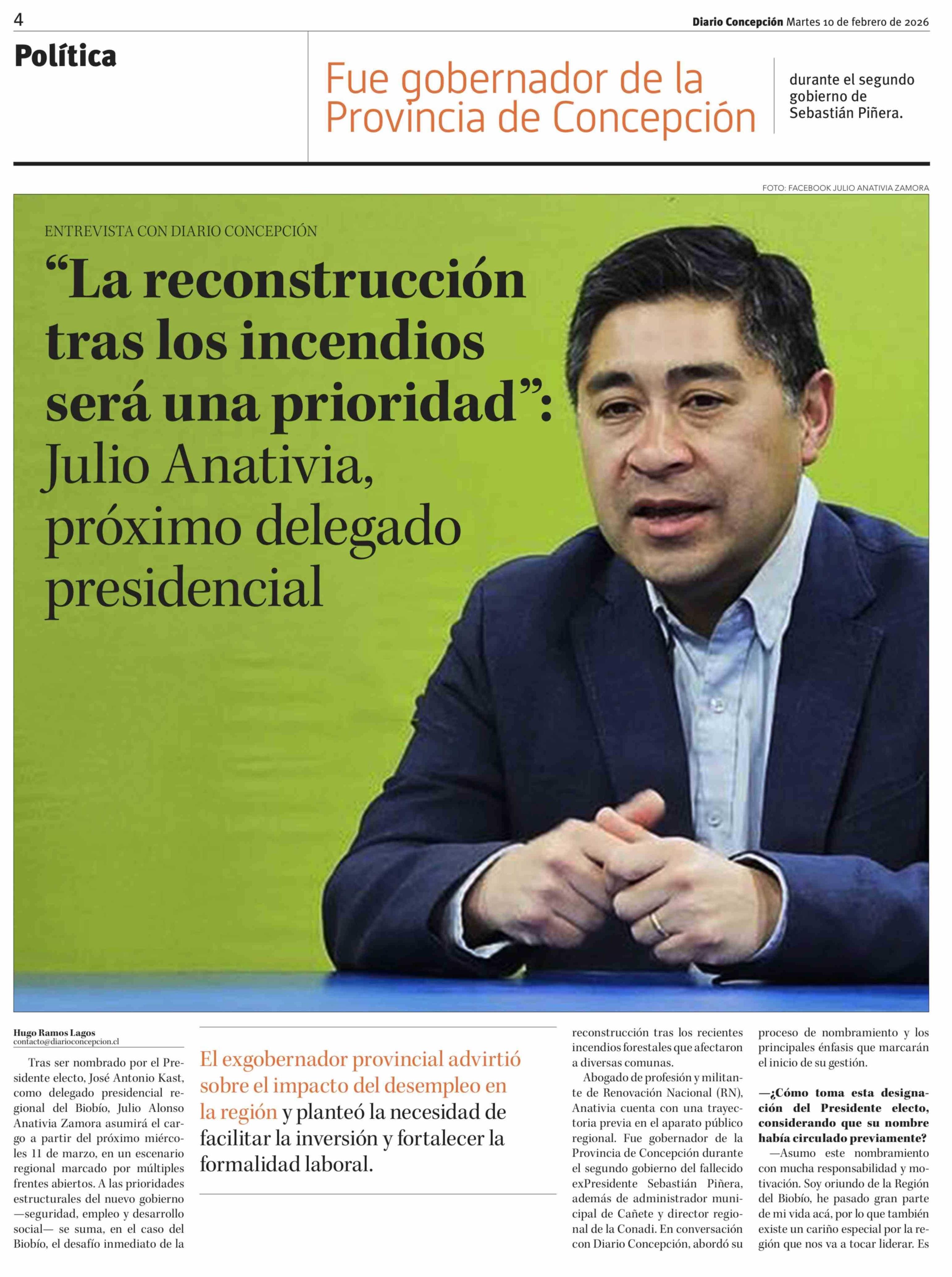 "La reconstrucción tras los incendios será una prioridad": Julio Anativia, próximo delegado presidencial