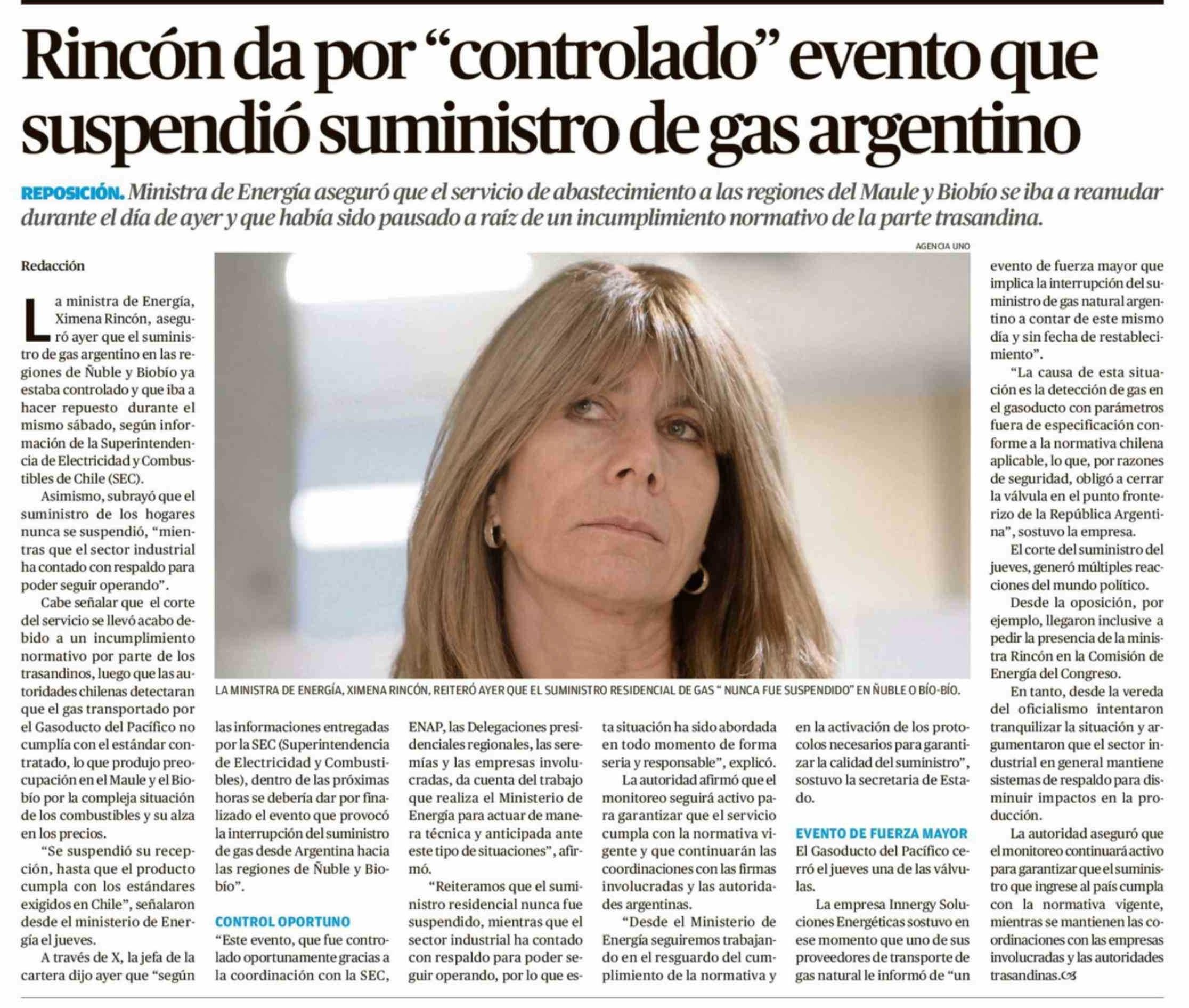 Rincón da por "controlado" evento que suspendió suministro de gas argentino