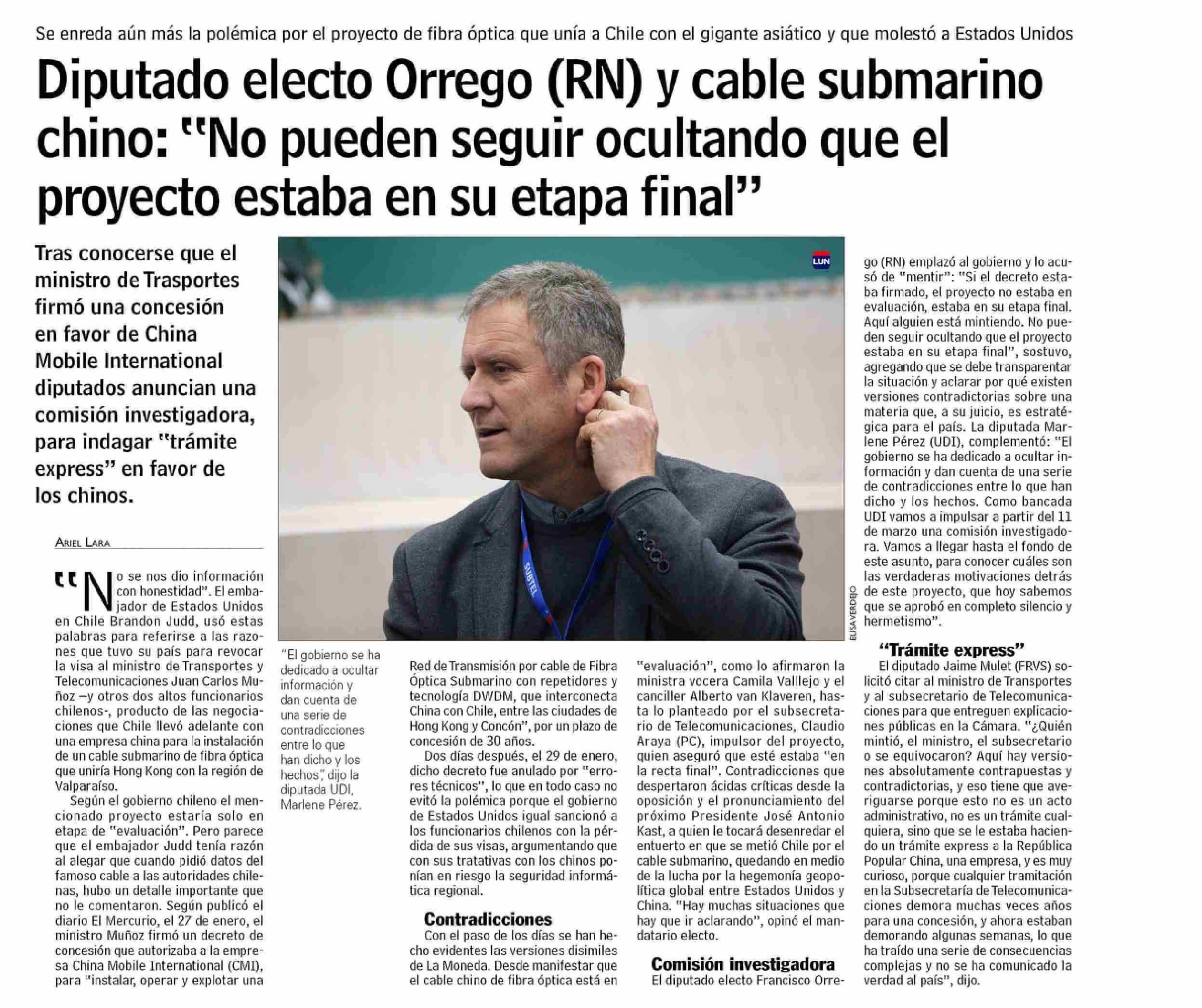 | Título: | Diputado electo Orrego (RN) y cable submarino chino: "No pueden seguir ocultando que el proyecto estaba en su etapa final” |
