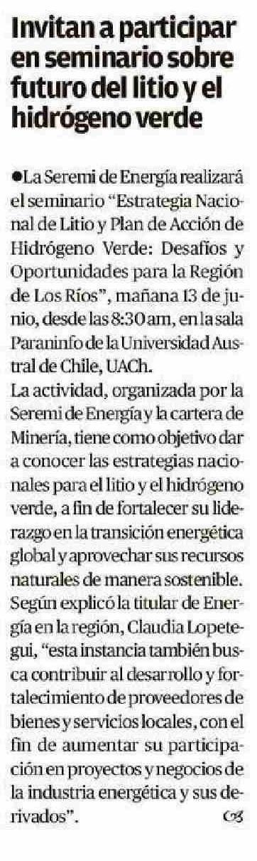 Invitan a participar en seminario sobre futuro del litio y el hidrógeno verde