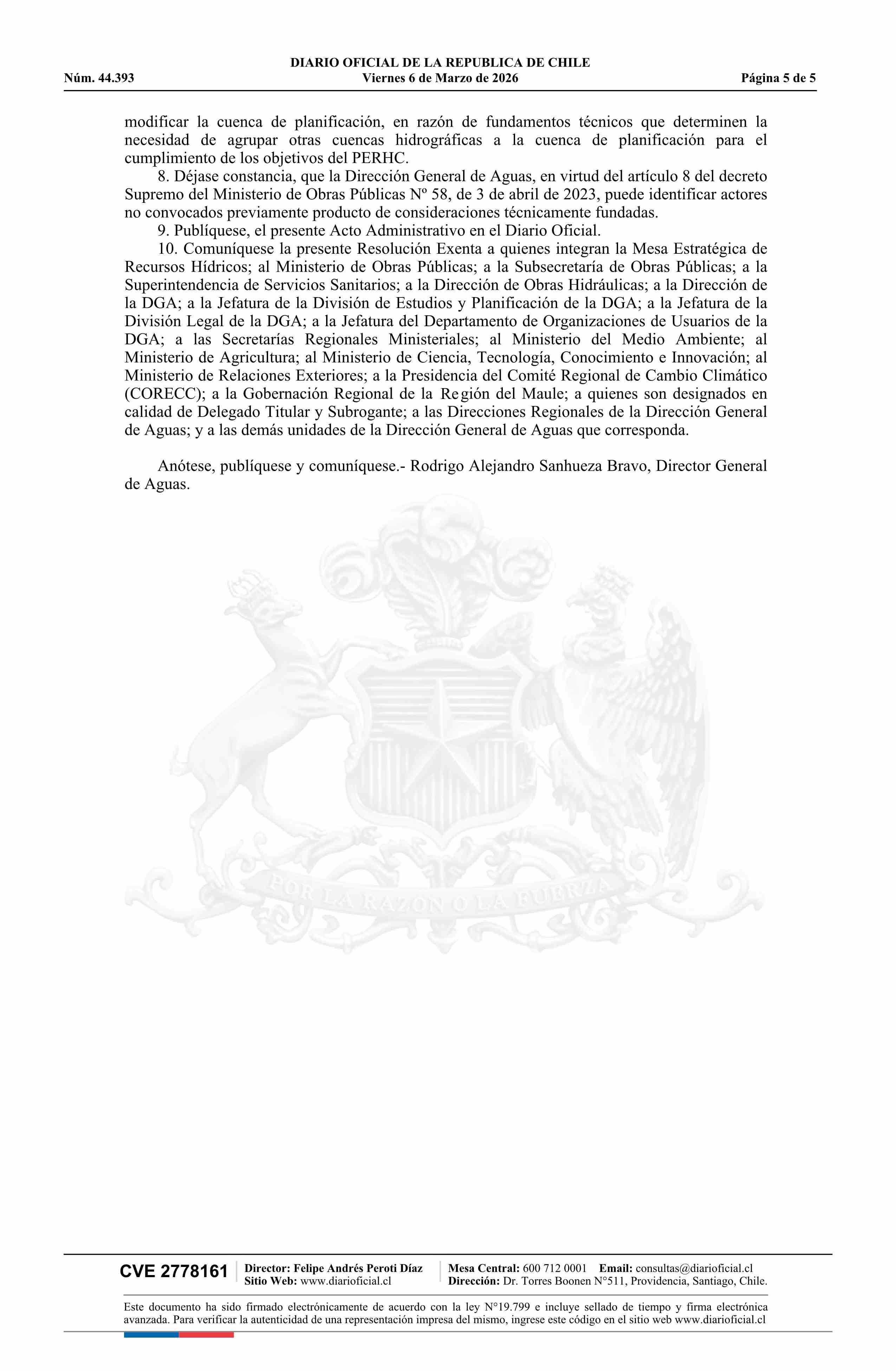 | Título: | Resolución exenta número 430, de 2026.- Delimita y denomina cuenca de planificación para el desarrollo del Plan Estratégico de Recursos Hídricos en la Cuenca del Río Maule y Adyacentes; constituye mesa estratégica de recursos hídricos; identifica convocados y asistencia a primera sesión; y designa d |