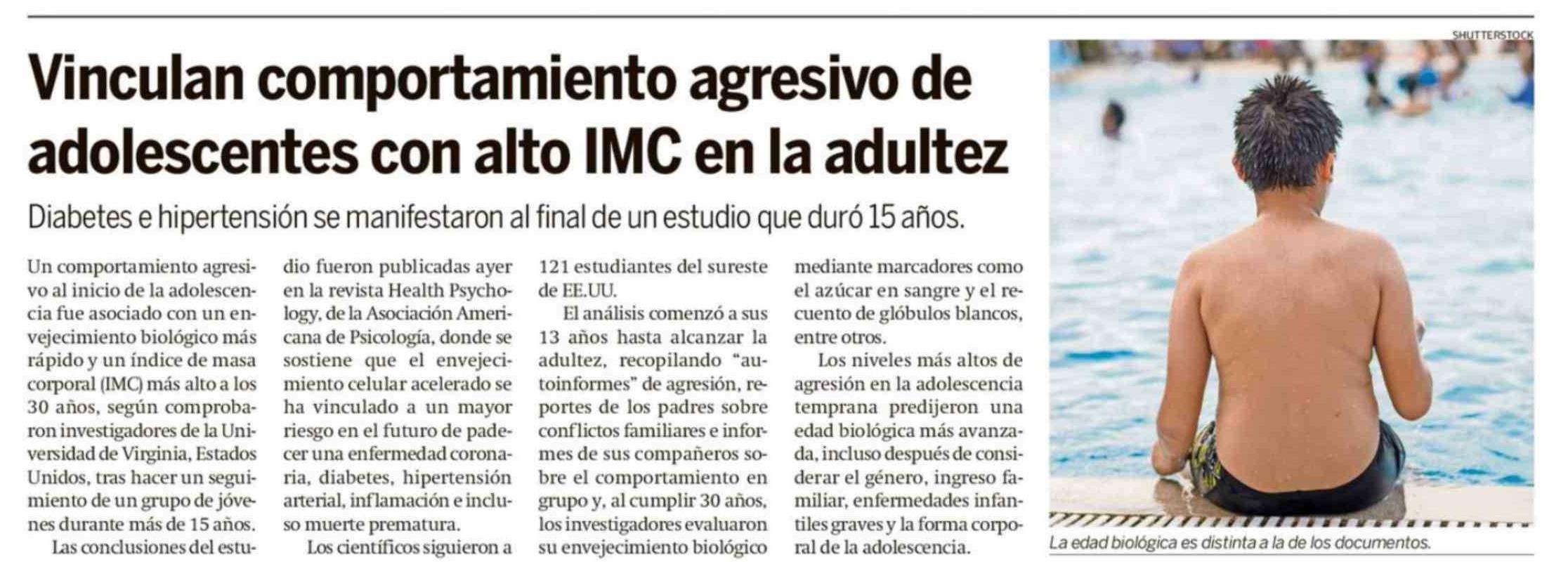 Vinculan comportamiento agresivo de adolescentes con alto IMC en la adultez