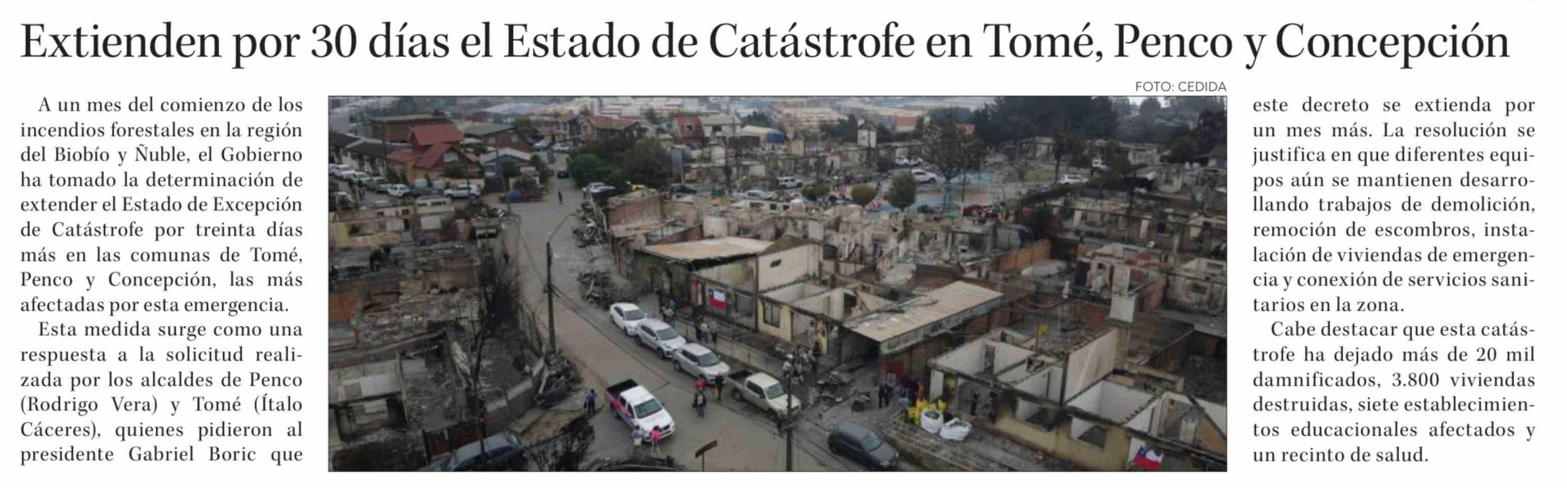 Extienden por 30 días el Estado de Catástrofe en Tomé, Penco y Concepción