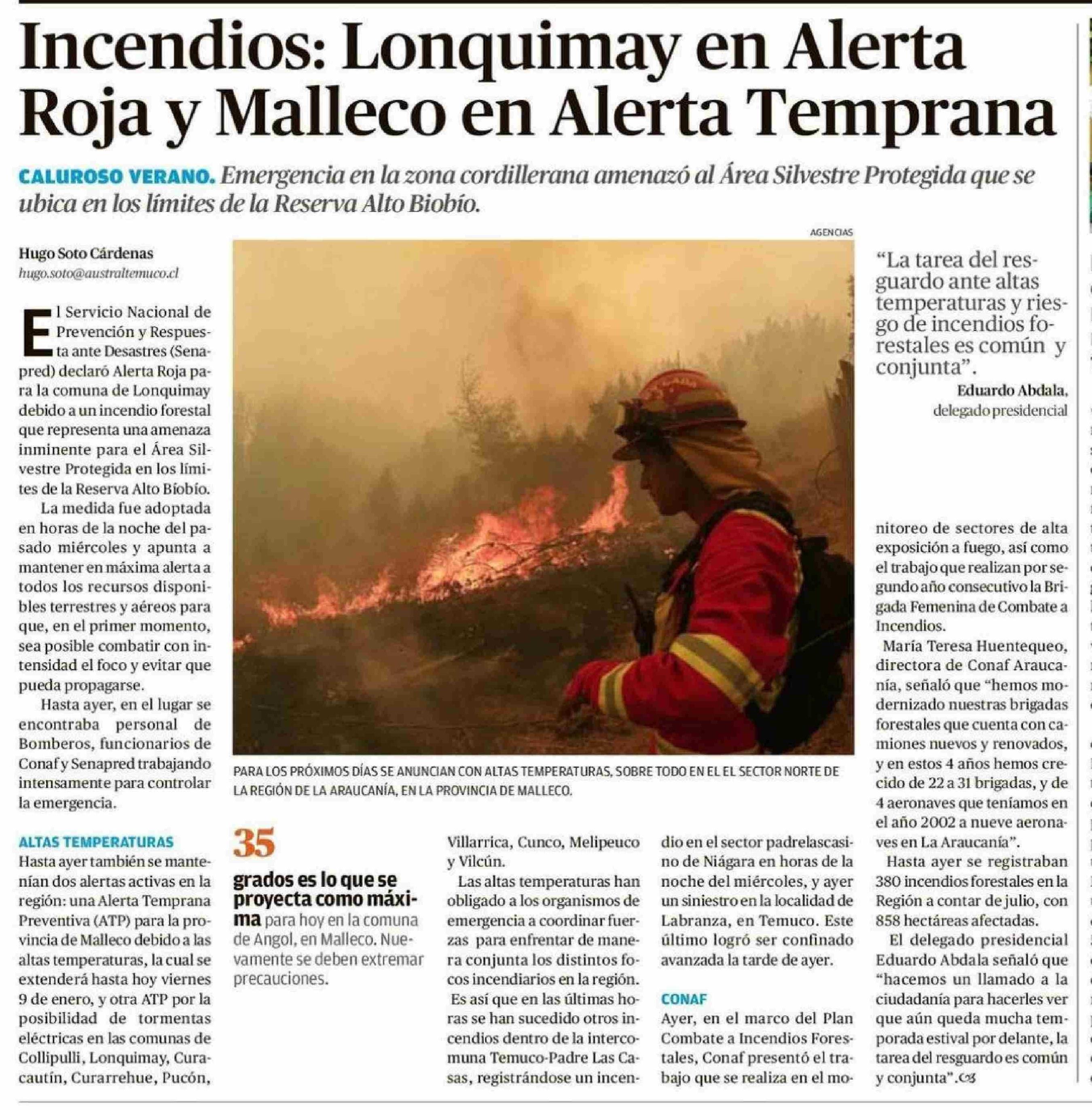 Incendios: Lonquimay en Alerta Roja y Malleco en Alerta Temprana