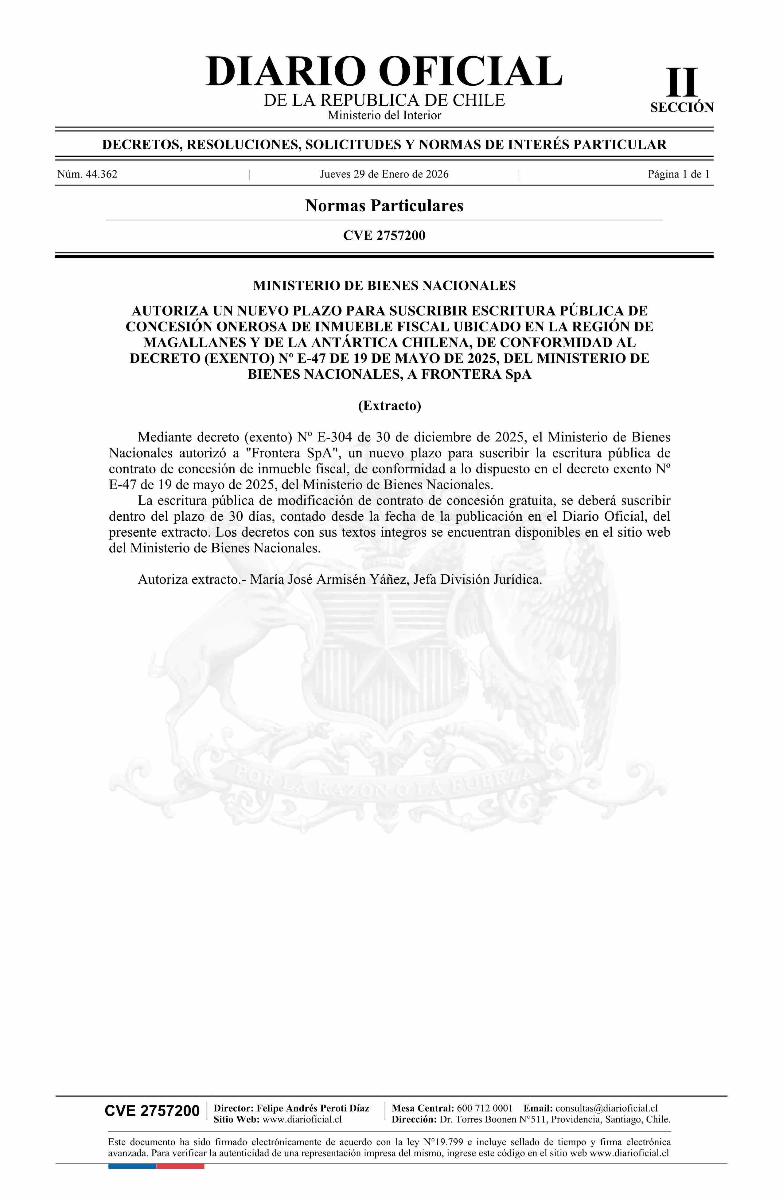 | Título: | Extracto de decreto exento número E-304, de 2025.- Autoriza un nuevo plazo para suscribir escritura pública de concesión onerosa de inmueble fiscal a Frontera SpA |