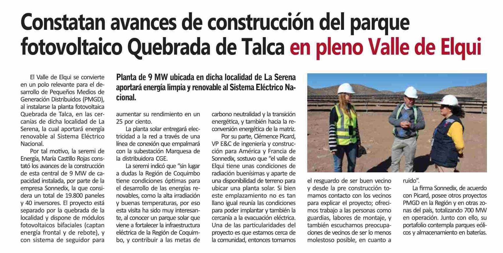 Constatan avances de construcción del parque fotovoltaico Quebrada de Talca en pleno Valle de Elqui