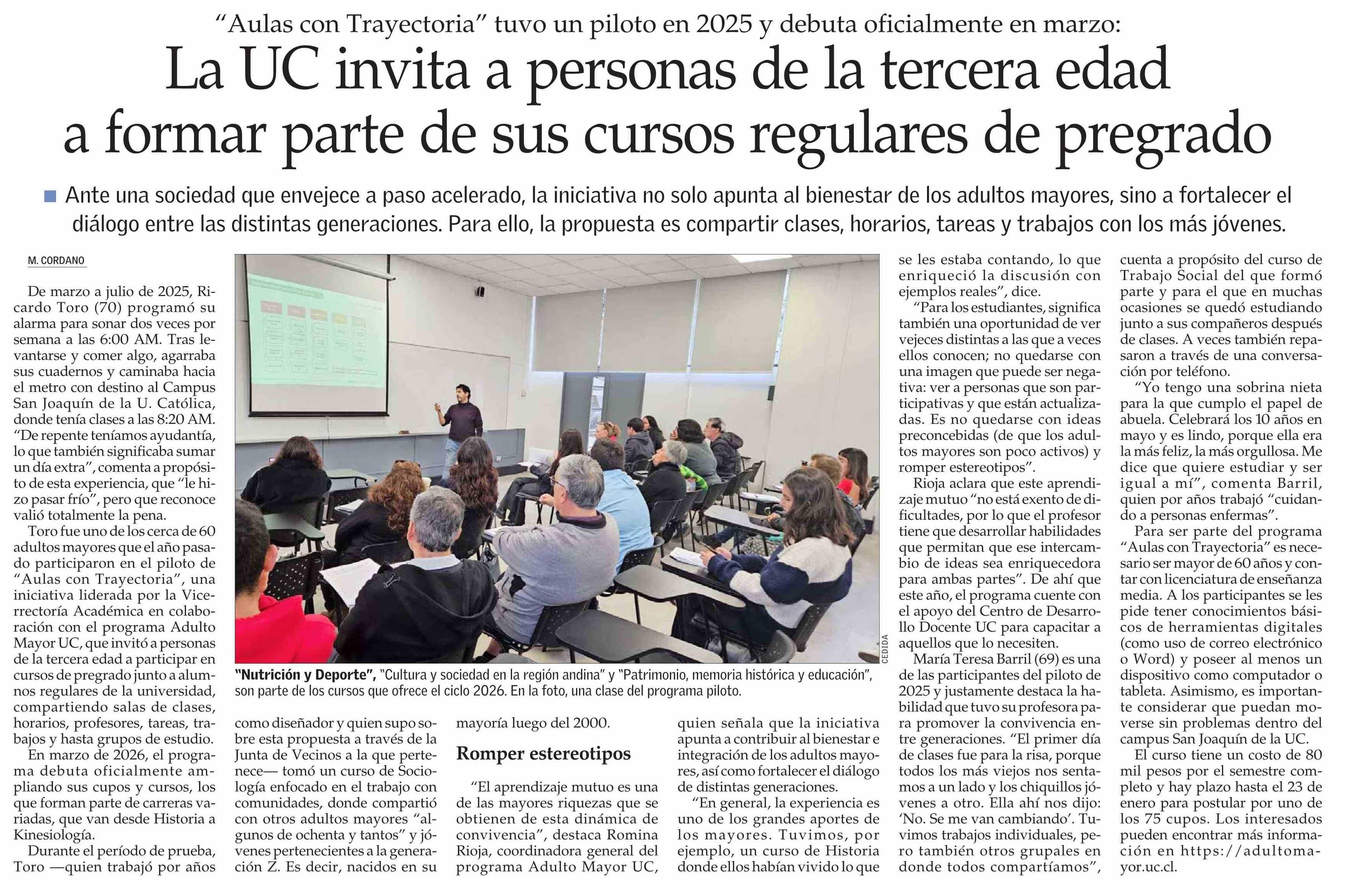La UC invita a personas de la tercera edad a formar parte de sus cursos regulares de pregrado