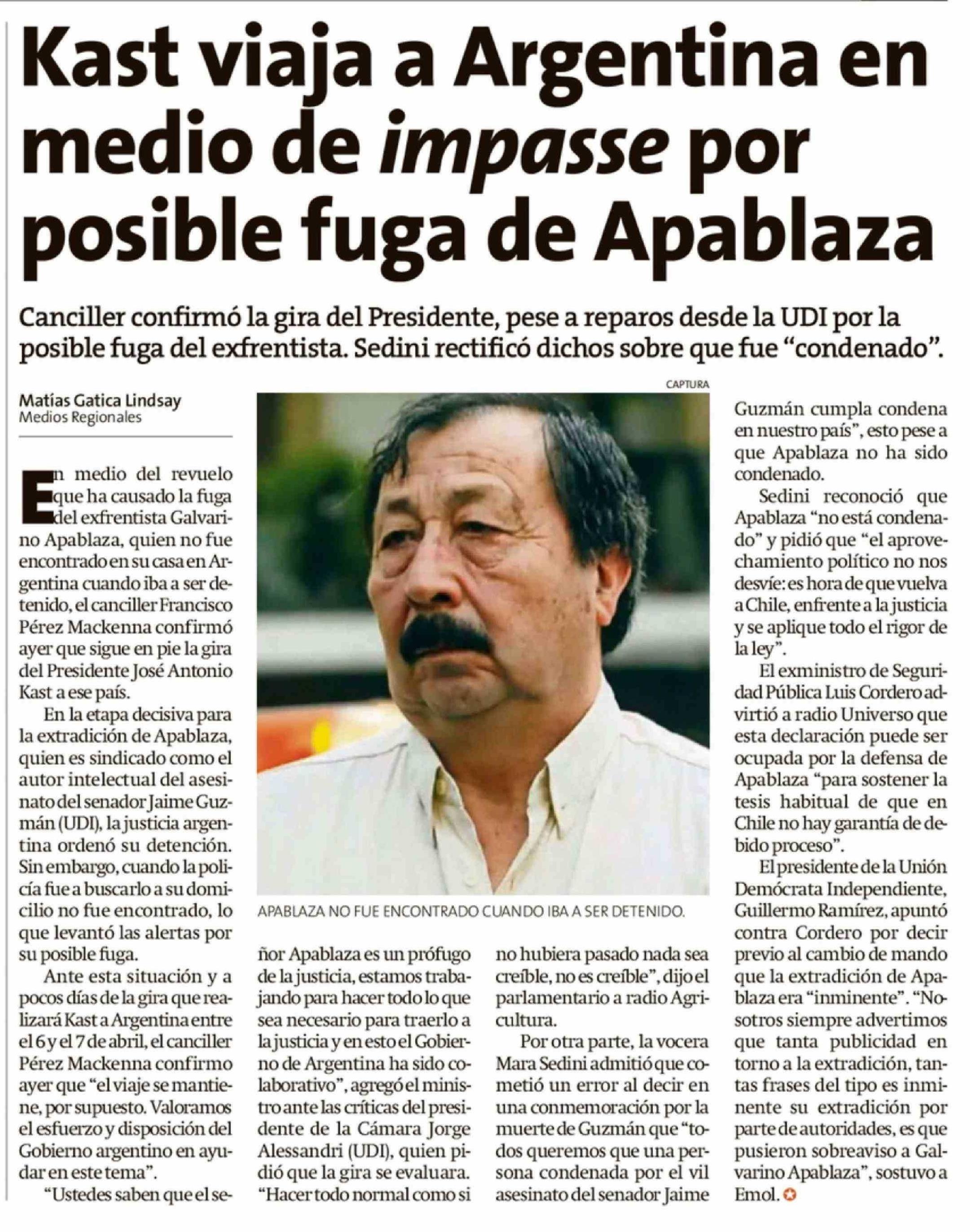 Kast viaja a Argentina en medio de impasse por posible fuga de Apablaza