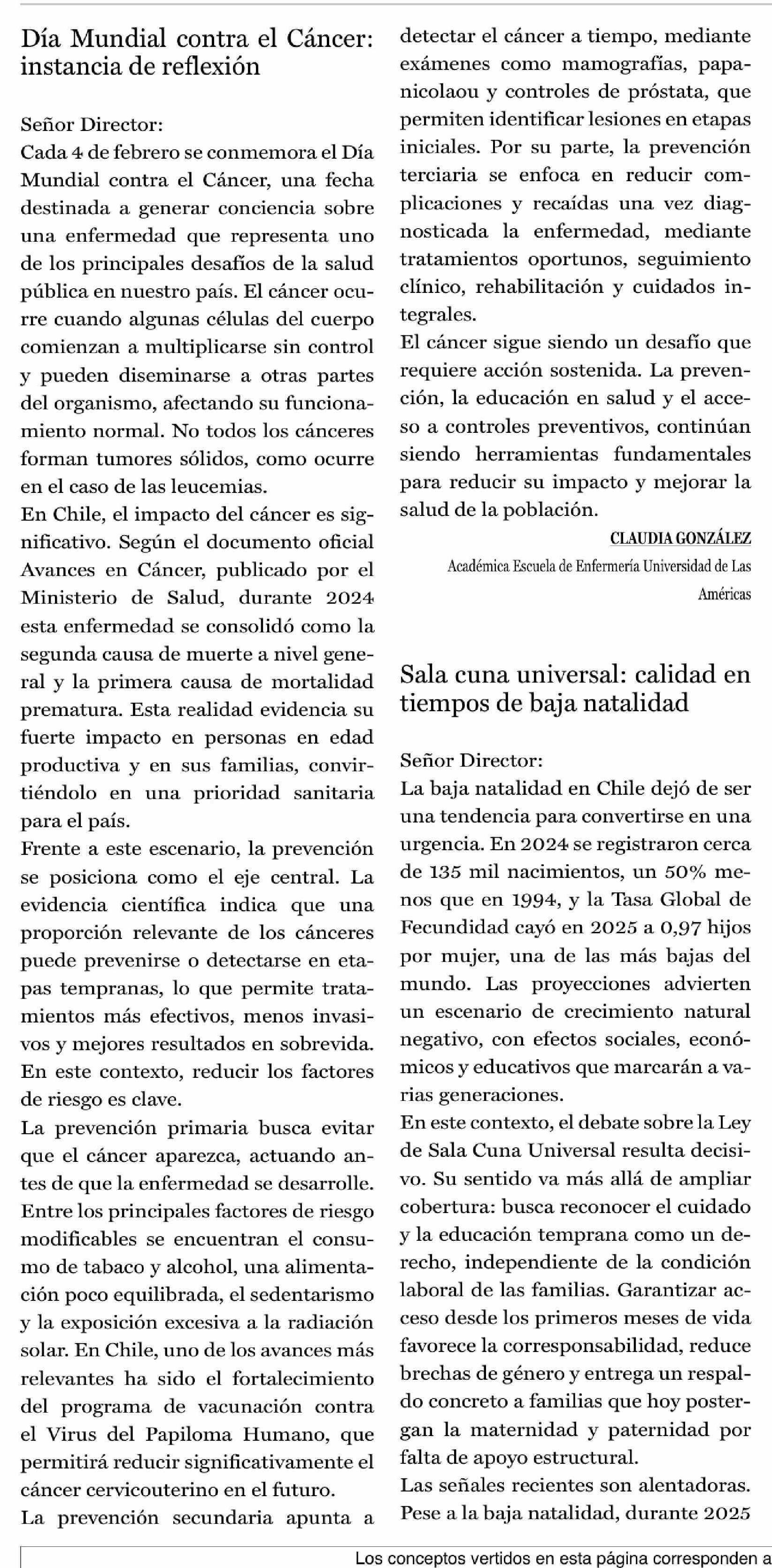 Cartas: Día Mundial contra el Cáncer: instancia de reflexión