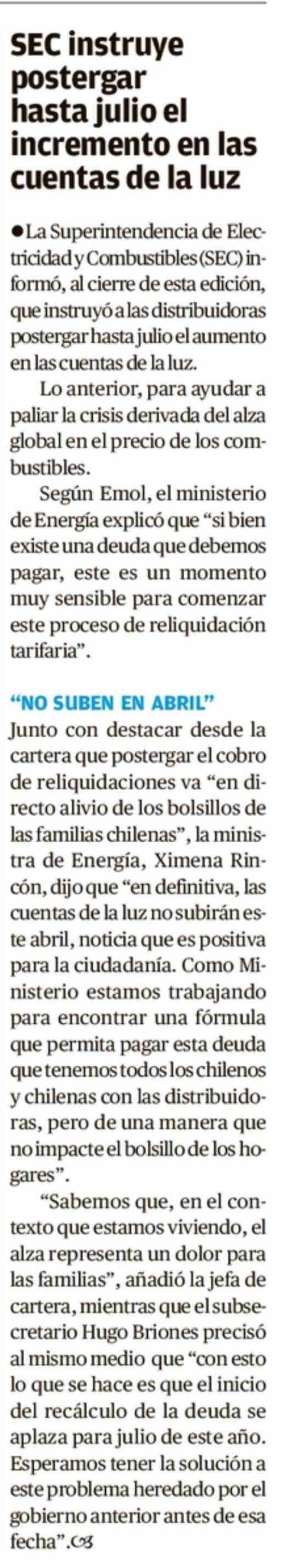 SEC instruye postergar hasta julio el incremento en las cuentas de la luz