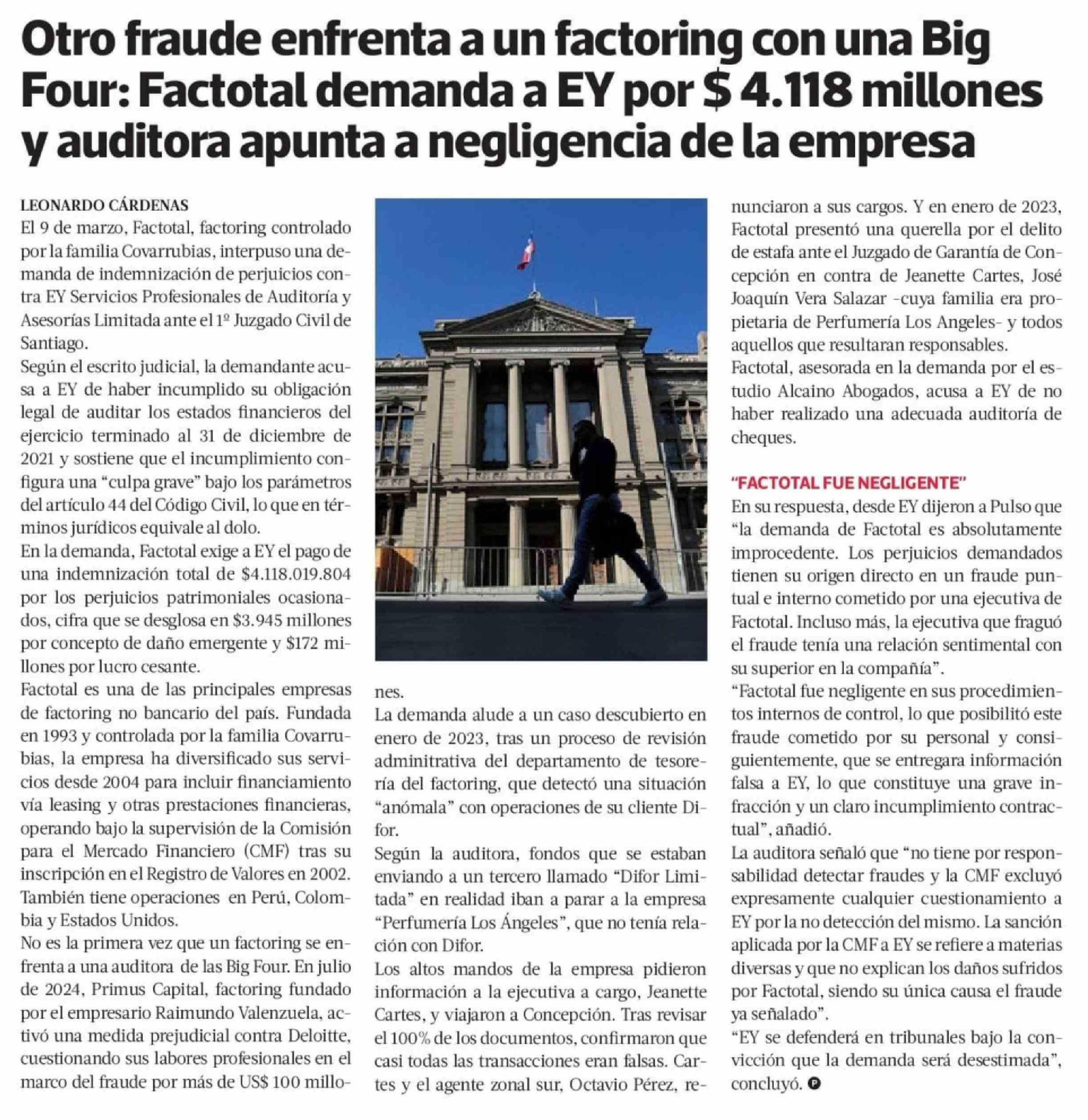 | Título: | Otro fraude enfrenta a un factoring con una Big Four: Factotal demanda a EY por $ 4.118 millones y auditora apunta a negligencia de la empresa |