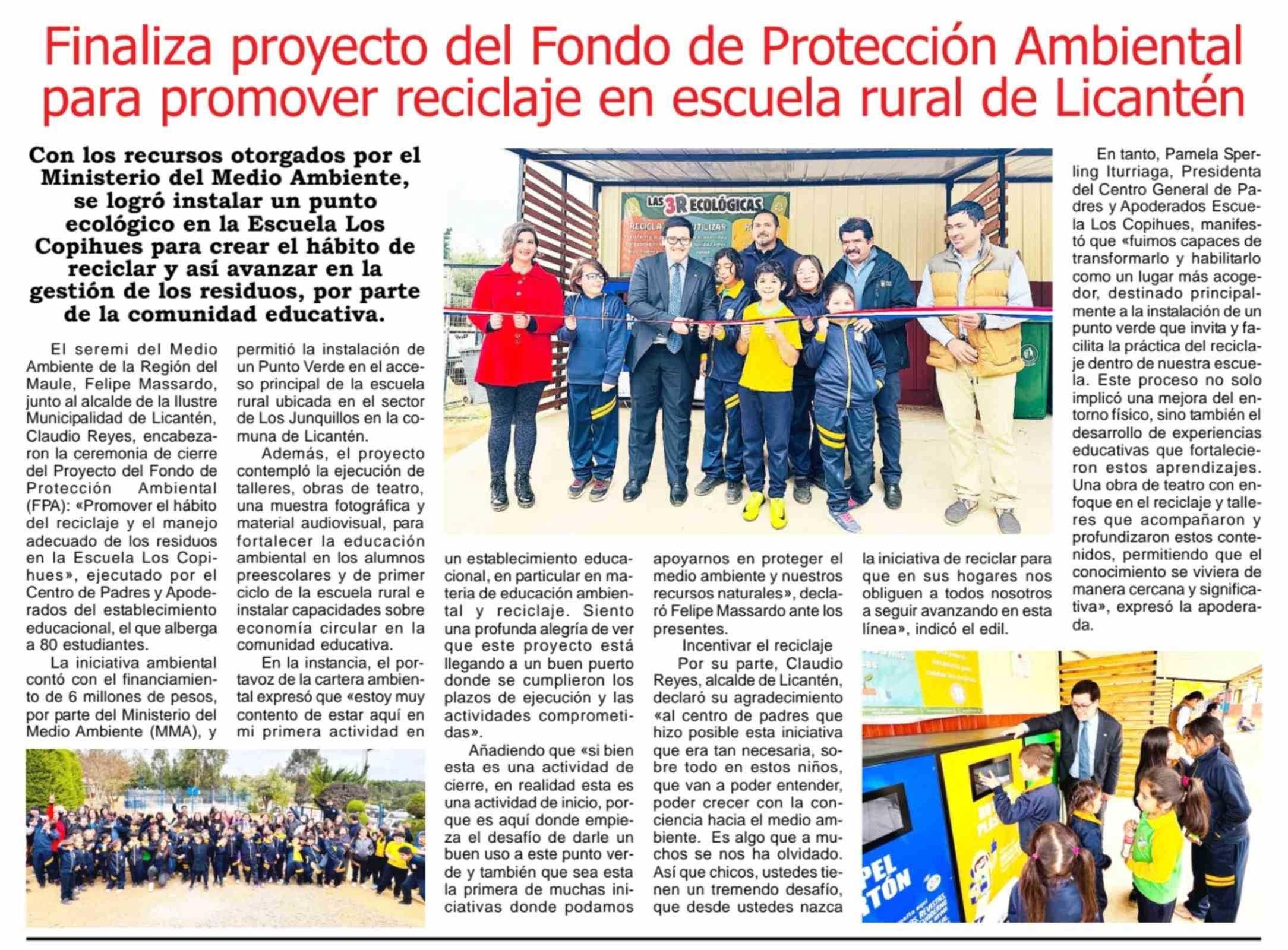 Finaliza proyecto del Fondo de Protección Ambiental para promover reciclaje en escuela rural de Licantén
