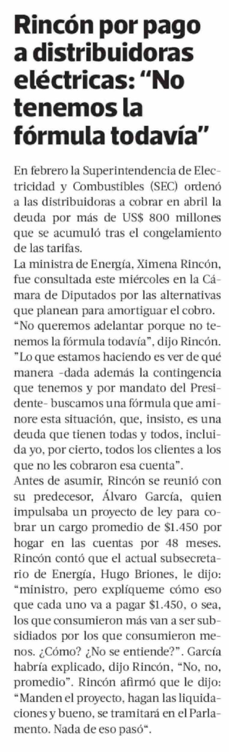 Rincón por pago a distribuidoras eléctricas: "No tenemos la fórmula todavía"