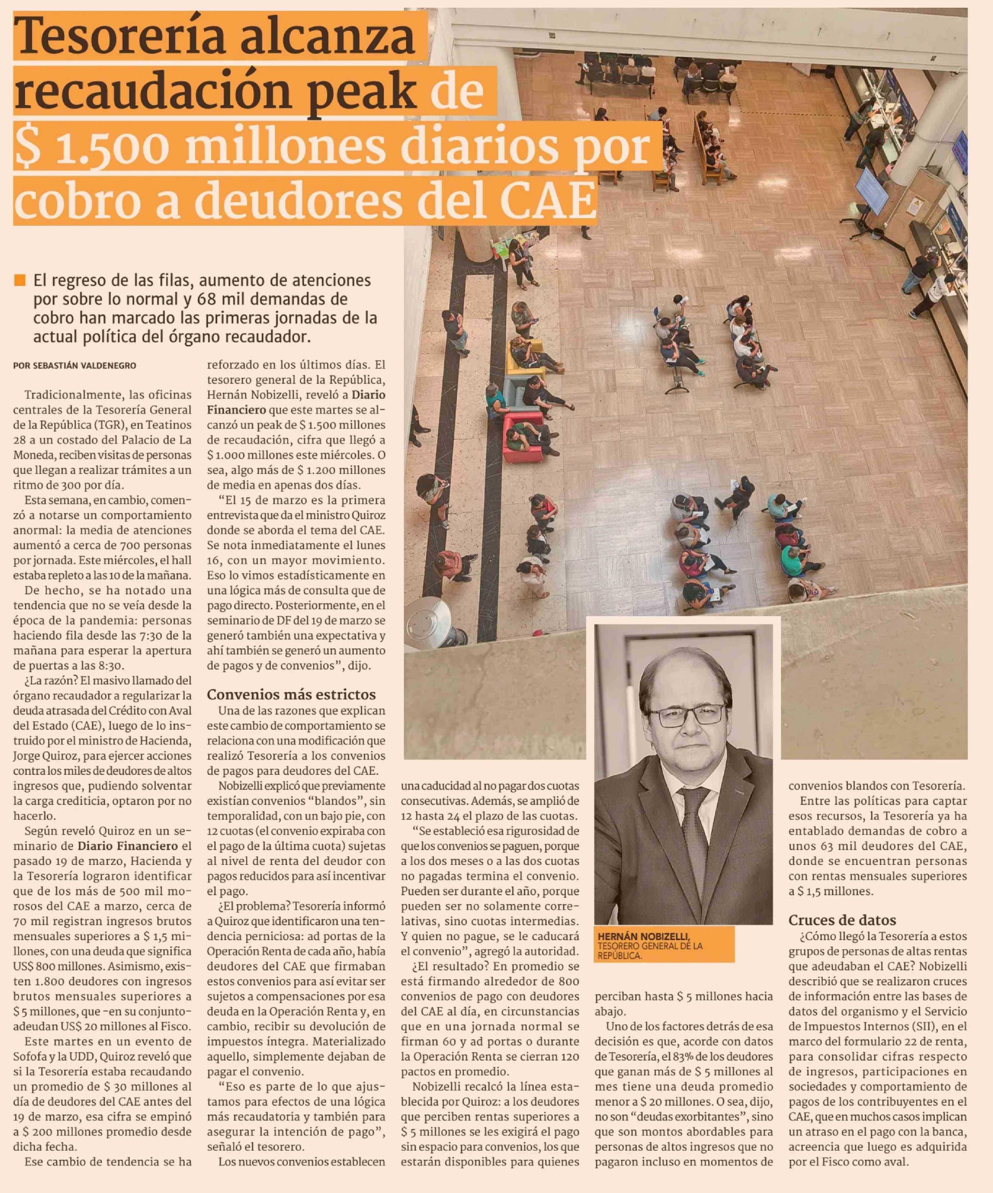 Tesorería alcanza recaudación peak de $ 1.500 millones diarios por cobro a deudores del CAE