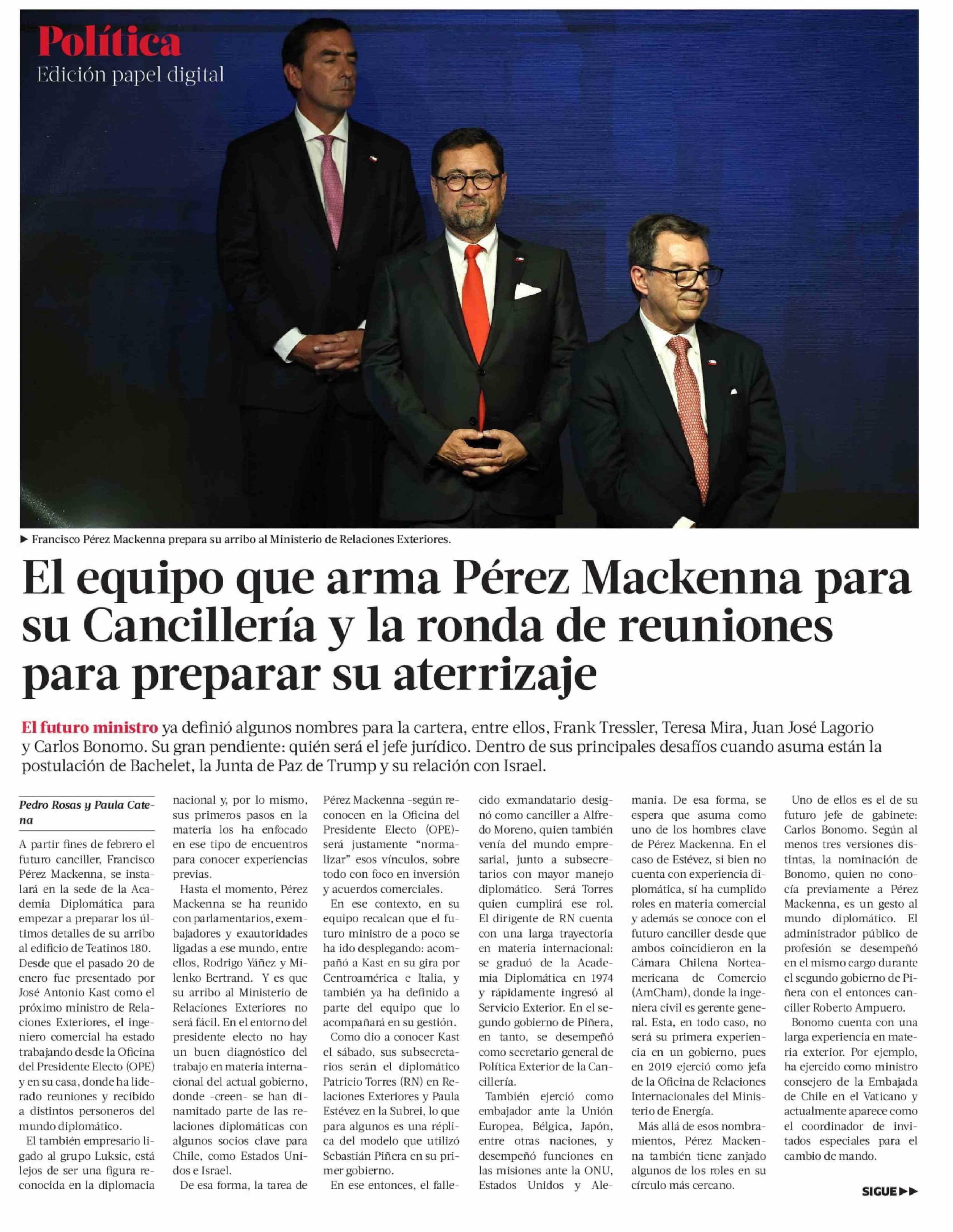 El equipo que arma Pérez Mackenna para su Cancillería y la ronda de reuniones para preparar su aterrizaje