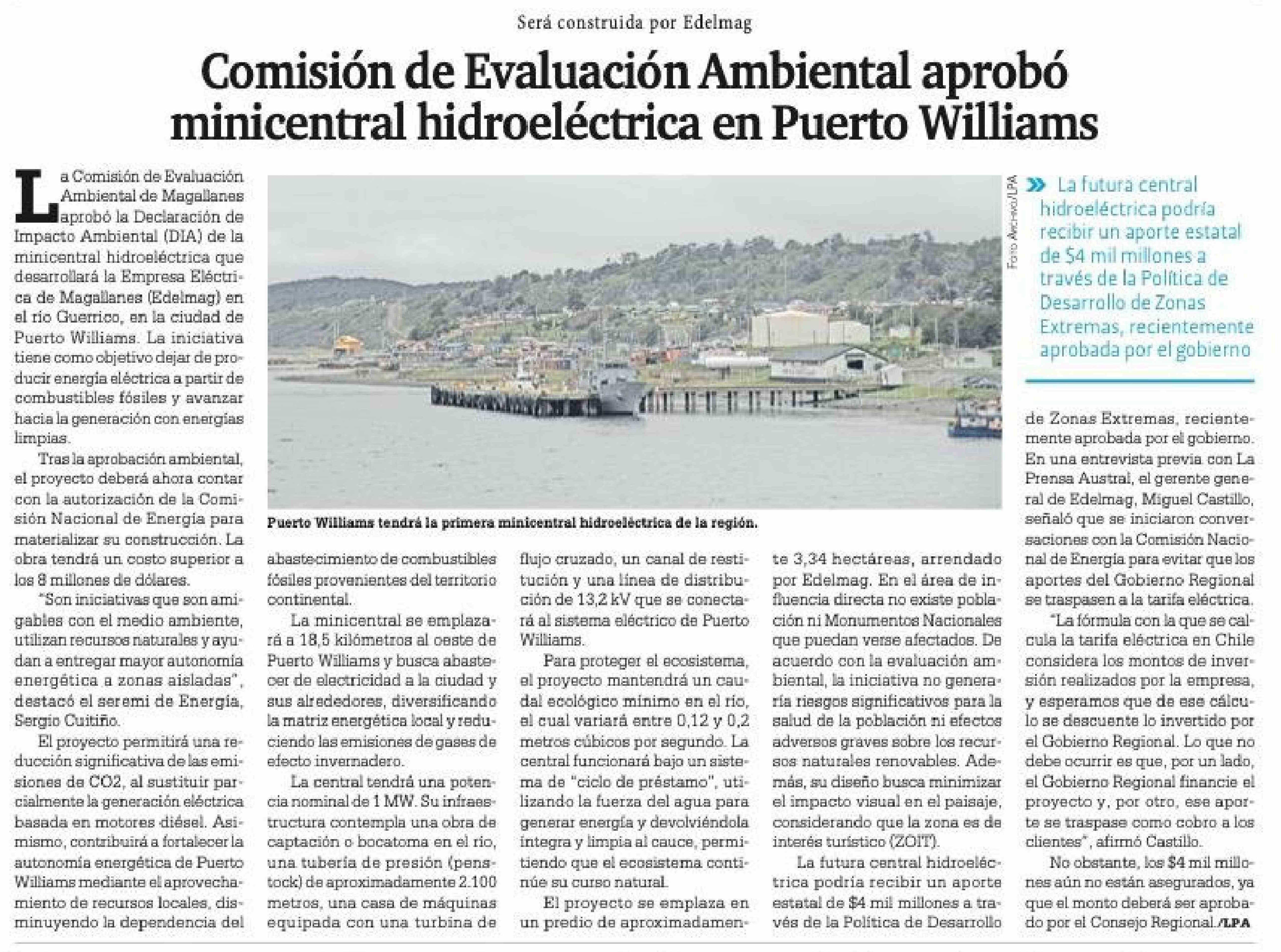 Comisión de Evaluación Ambiental aprobó minicentral hidroeléctrica en Puerto Williams