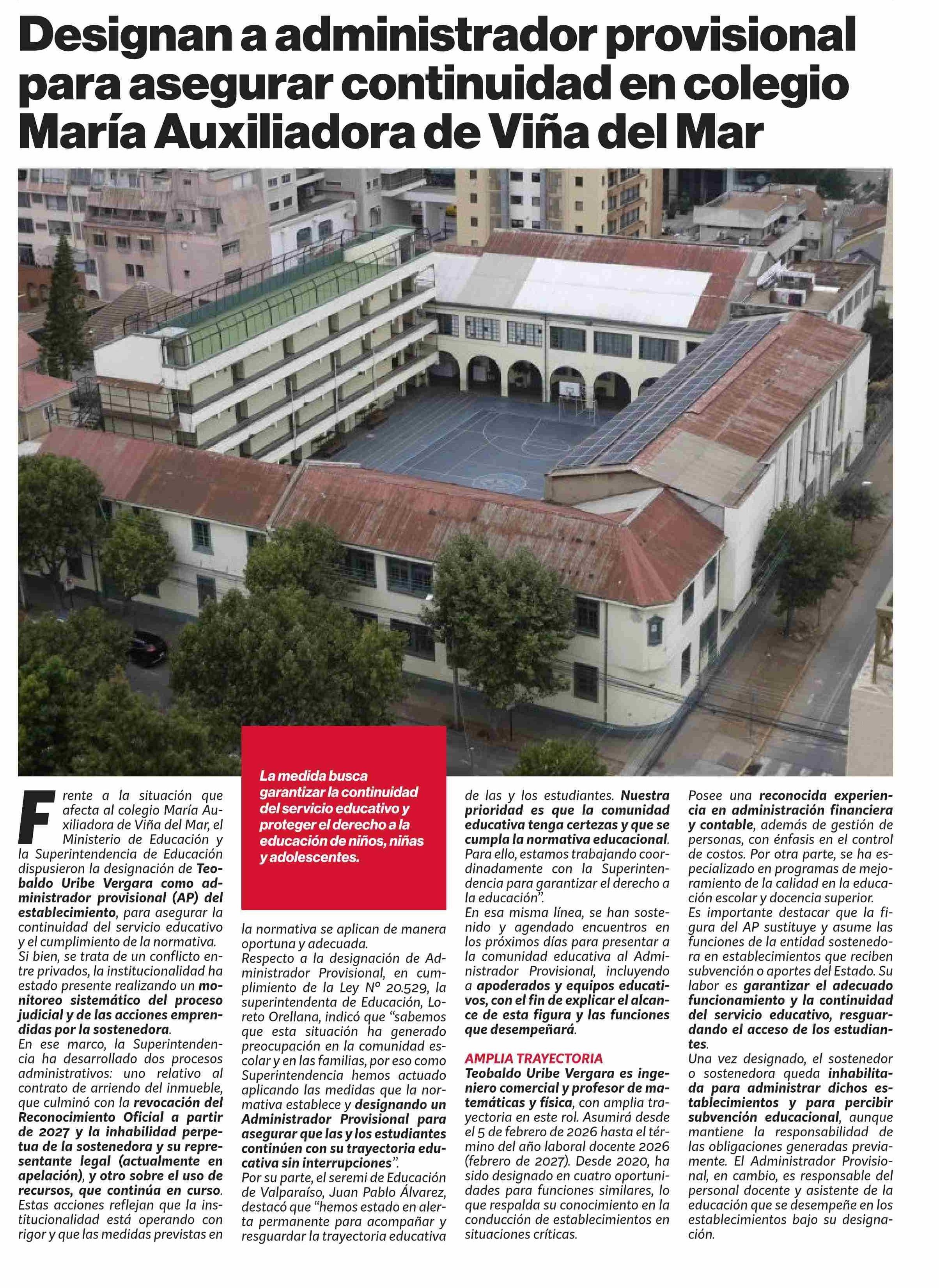Designan a administrador provisional para asegurar continuidad en colegio María Auxiliadora de Viña del Mar